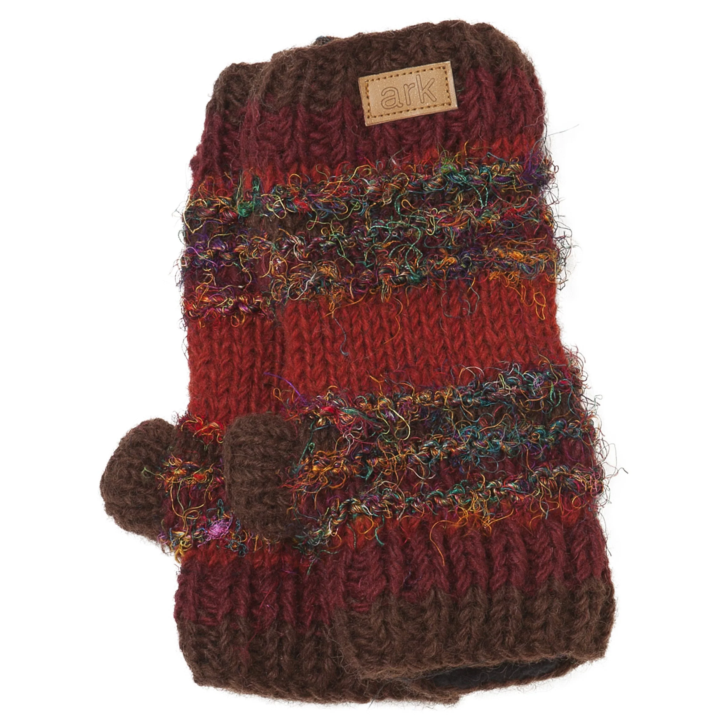 Mitaines sans doigts 100% laine, adornées de soie recyclée colorée et doublée en polar pour plus de chaleur.