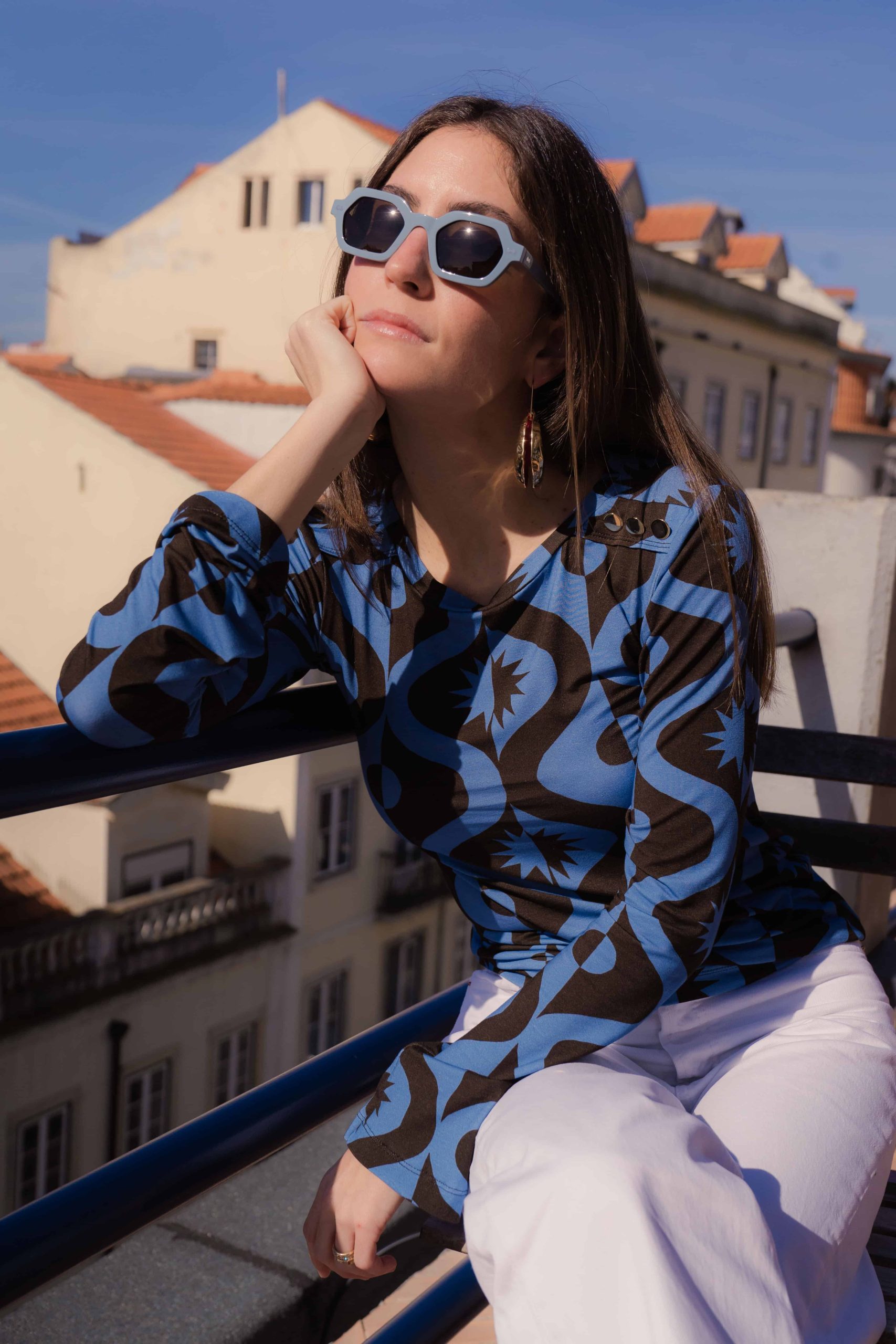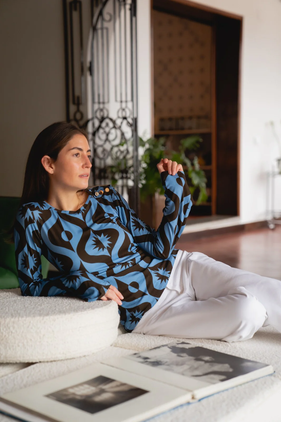 Le top Mona est le haut parfait qui se porte avec tous vos jeans, pantalons ou jupes. Il apporte une touche de féminité et d’allure à votre tenue. Avec une coupe ajustée et des manches légèrement évasées, il se porte en toutes circonstances, aussi bien tous les jours que pour des occasions spéciales. Nous aimons tout particulièrement le combo top Mona/pantalon Andrea du même imprimé pour un effet combinaison jumpsuit.