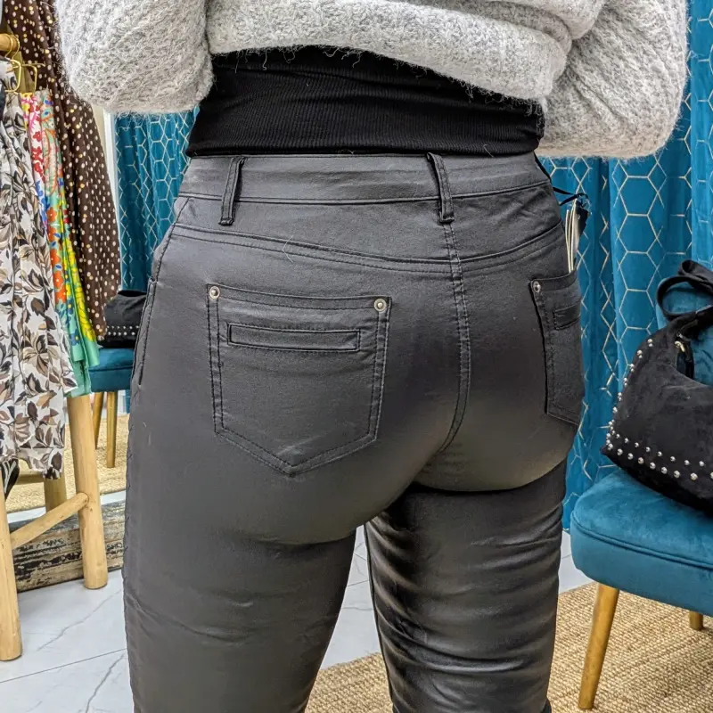 Le pantalon enduit style motard noir est extrêmement polyvalent. Il peut être associé à une variété de vêtements, que ce soit un t-shirt décontracté pour un look casual ou une chemise habillée pour une sortie en soirée. Sa couleur noire permet de le porter en toute saison, et il s’adapte facilement à différents styles, qu’ils soient rock, urbains ou chic.