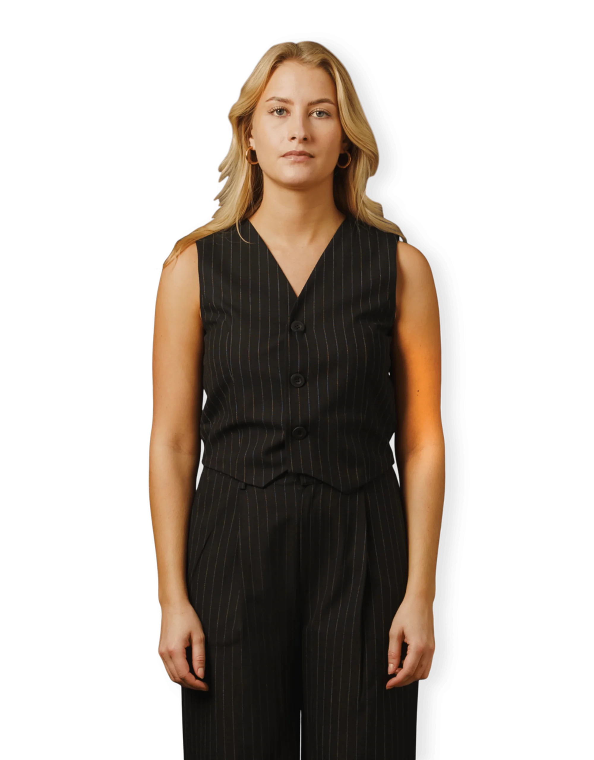 The Oval Square Pacino Waistcoat i Black Pinstripe giver et moderne twist på et klassisk design og er perfekt til dem, der værdsætter underspillet elegance. Fremstillet i en blød polyesterblanding har denne waistcoat en draperet silhuet og v-hals, der afspejler brandets fokus på kontrast i designet. Det sorte pinstripe-mønster tilfører et sofistikeret præg og gør den til et alsidigt stykke, der løfter enhver garderobe — uanset om den styles med afslappet tøj eller til mere formelle sæt.