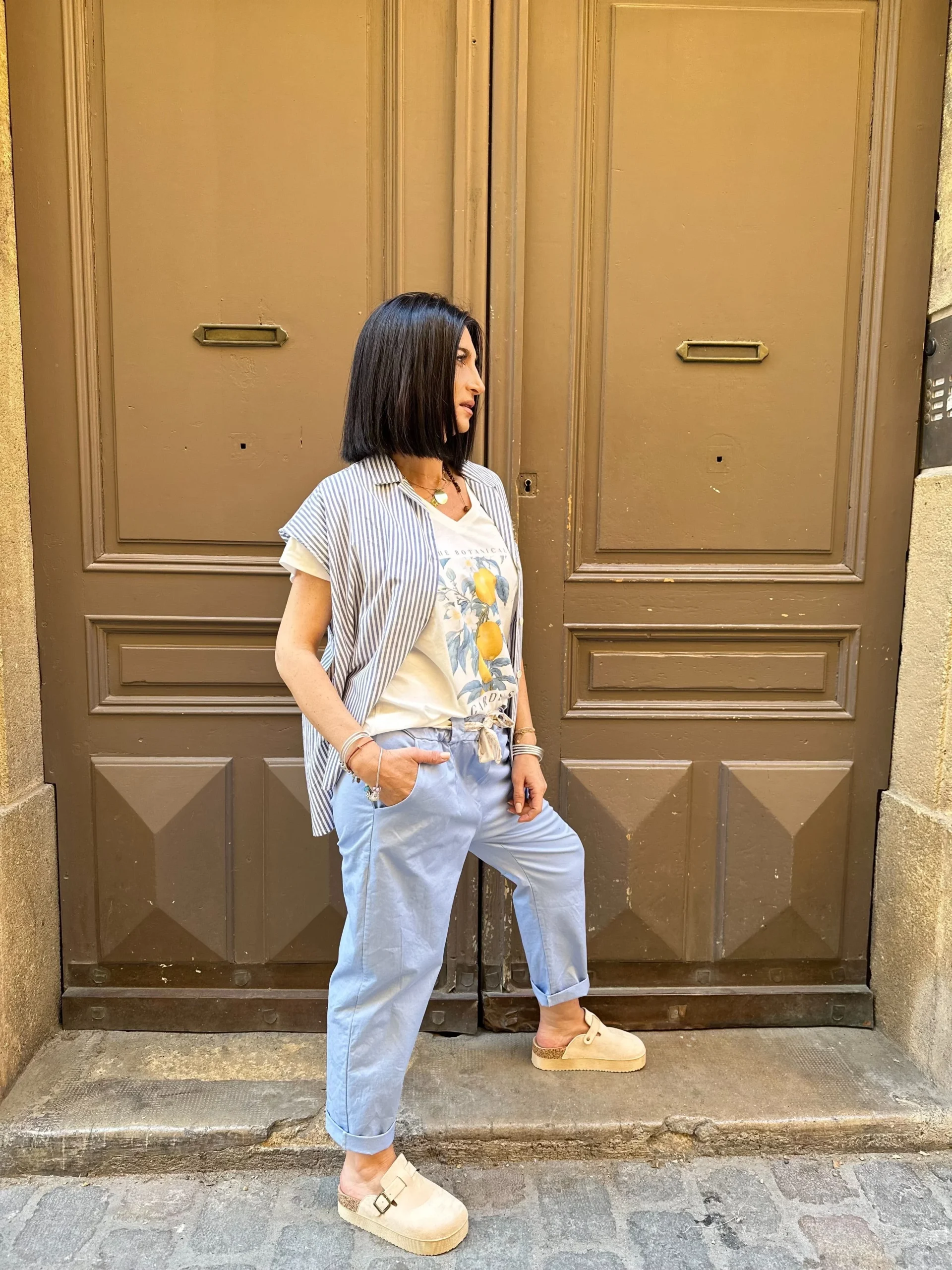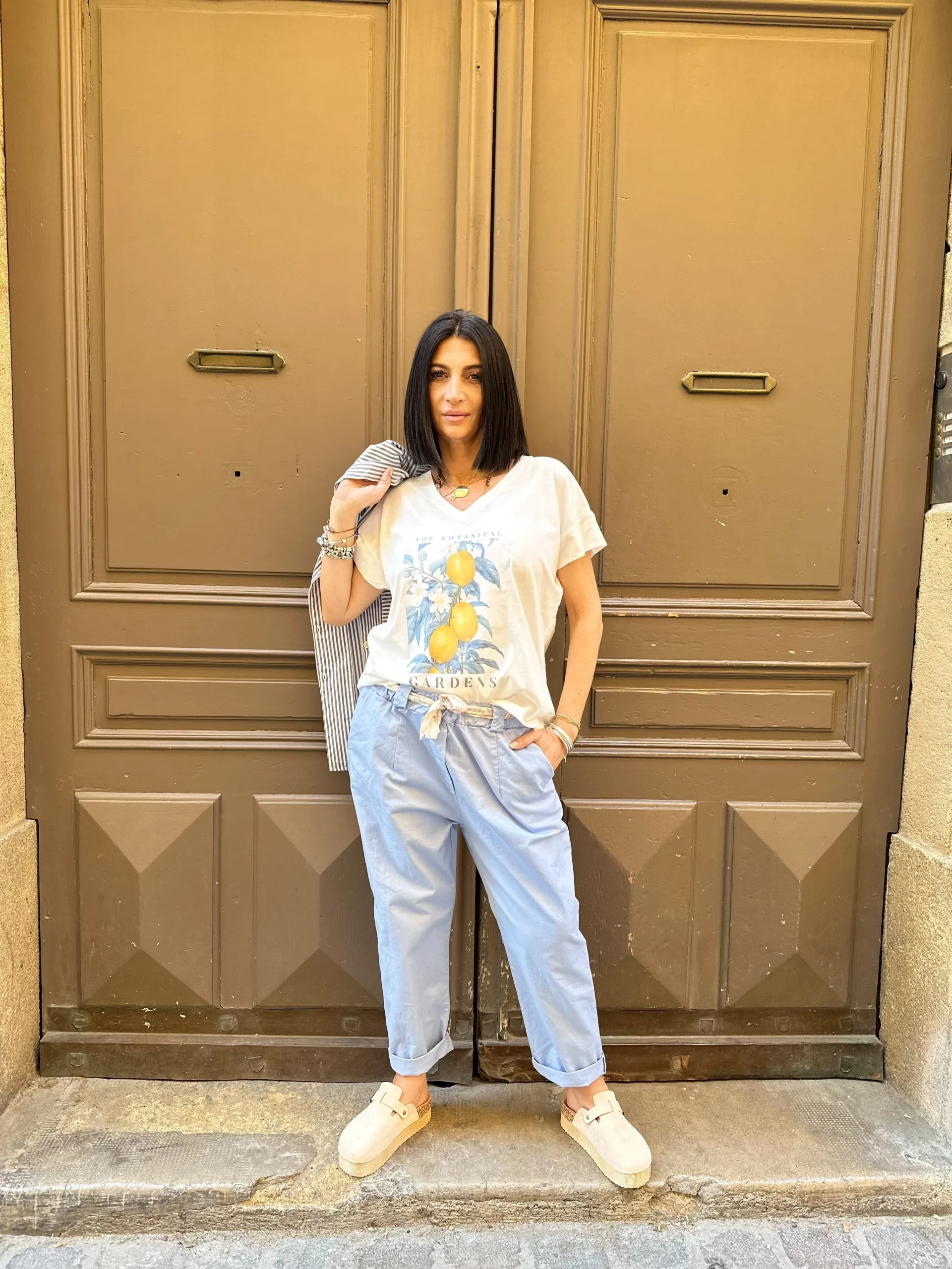 Le pantalon LIAM est un choix chic et intemporel pour une allure impeccable en toutes occasions ! Description Vendu avec la ceinture Long Elastique à la taille taille unique du 36 au 44 Composition 98% coton 2% elastan Entretien Se référer à l’étiquette Fabrication fabrIqué en Italie