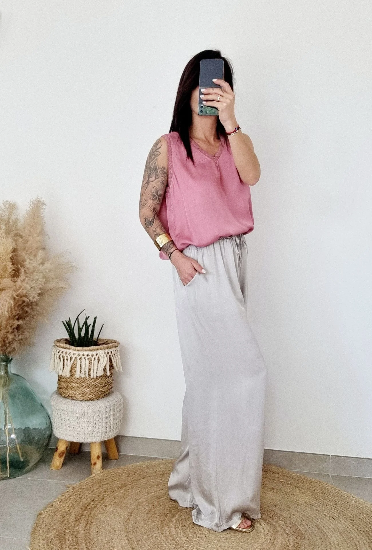 Associez-le à un top fluide ou une chemise oversize pour un look raffiné et tendance. Ajoutez des sandales dorées ou des baskets blanches pour une allure estivale décontractée. Pour un effet chic, combinez-le à des bijoux dorés et une veste légère en lin.