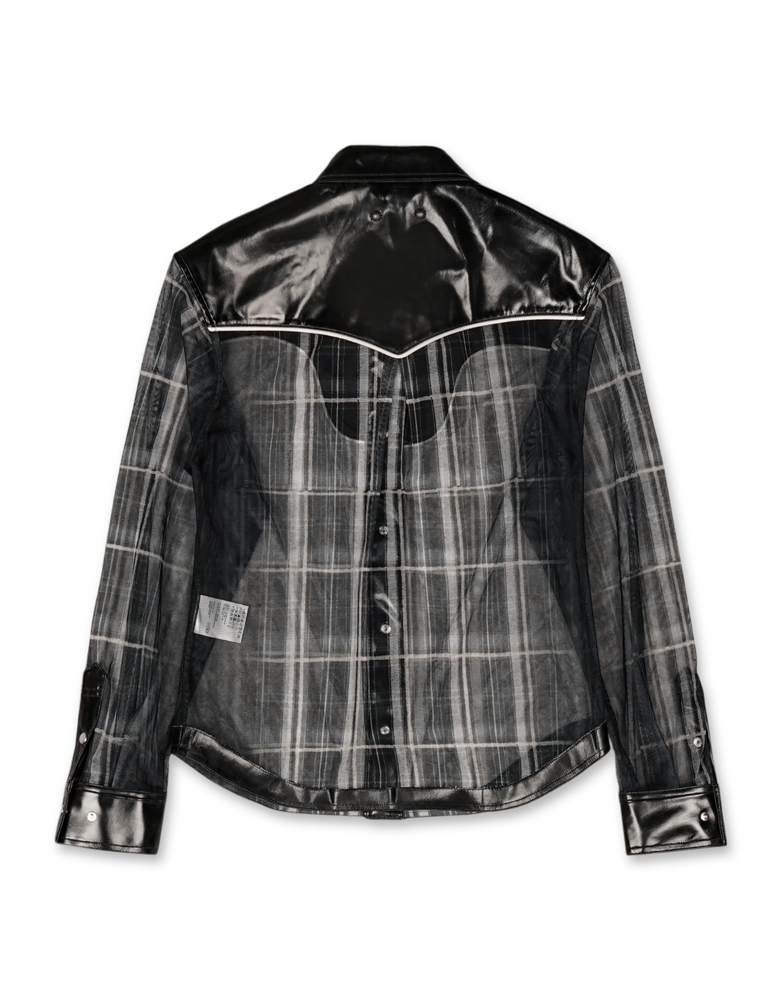 Andersson Bell Patent Leather Combo Sheer Western Shirt i sort tilbyder en unik blanding af materialer og kombinerer polyestermesh med iøjnefaldende imiteret læderdetaljer. Skjorten har klassiske western-detaljer som piping-snor og nitter, hvilket giver et moderne twist på en tidløs stil. Den ternede print-mesh tilfører dybde og tekstur, hvilket gør den til et iøjnefaldende stykke for dem, der ønsker at løfte garderoben med en sofistikeret kant. Ideel til modebevidste personer, der søger et dristigt men raffineret look.