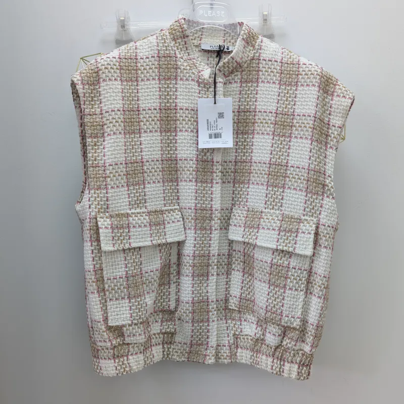 Le blouson sans manches de la marque italienne Please est une pièce à la fois tendance et pratique, idéale pour les saisons intermédiaires. Fabriqué dans le même tweed de qualité, il présente un design élégant avec un motif de carrés blancs entourés de liserés roses, ainsi que des carrés en couleur taupe. Ce blouson est parfait pour ajouter une touche de sophistication à n’importe quelle tenue.