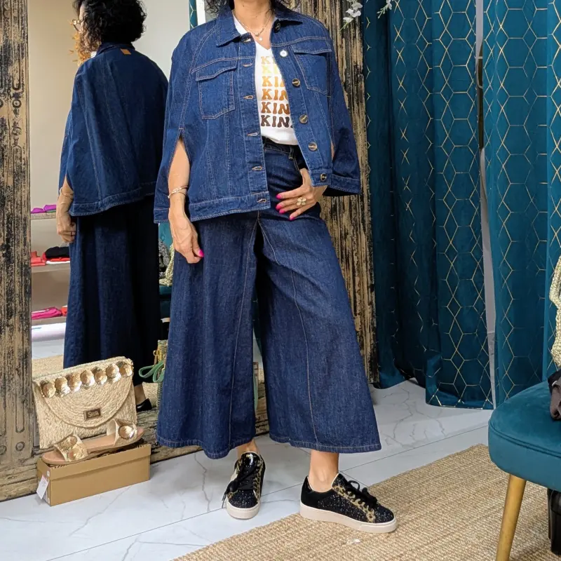 La veste en jean cape se caractérise par son assemblage soigné avec plusieurs empiècements, ce qui lui confère une texture et un style distinctifs. Les deux poches plates à rabat ajoutent une touche pratique tout en préservant l’esthétique générale de la pièce. Que ce soit pour ranger vos petits objets ou simplement pour le style, ces poches sont à la fois fonctionnelles et élégantes.