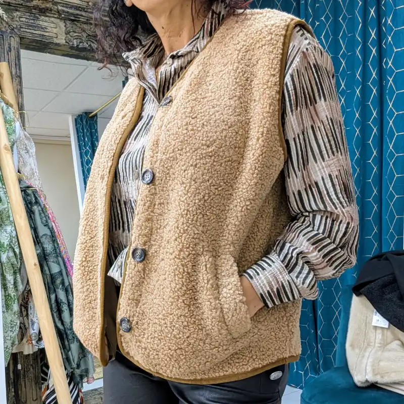 Le gilet est disponible en couleur camel, agrémenté de biais de couleur marron, créant un contraste élégant et chaleureux. De plus, une version noire est également proposée, avec les mêmes biais marron, permettant ainsi de choisir la couleur qui convient le mieux à votre style personnel. Ces options de couleur font de ce gilet une pièce polyvalente qui s’adapte facilement à différentes tenues.