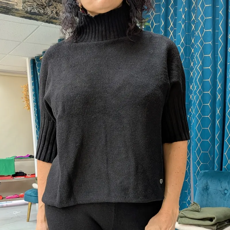 Ce pull se distingue par sa coupe courte et large, offrant une silhouette décontractée et moderne. Les manches 3/4 ajoutent une touche unique, avec un tricot différent en grosse maille. Cette conception permet d’obtenir un effet texturé qui apporte du caractère à la pièce. Les manches sont resserrées à la fin, créant un joli contraste avec le reste du pull, tout en ajoutant une dimension visuelle intéressante.