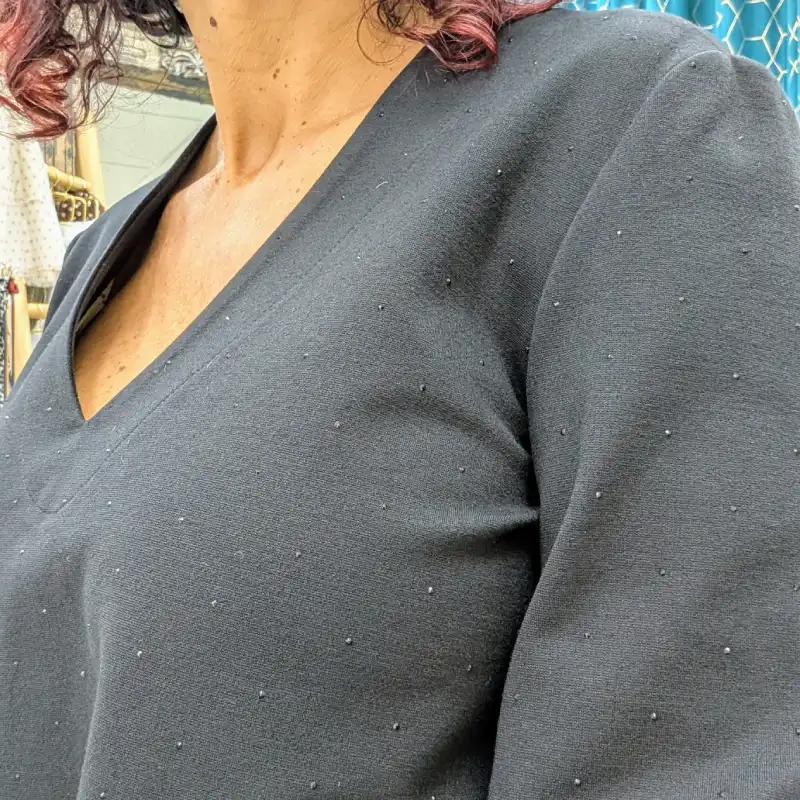 Cette robe se distingue par ses manches 3/4 évasées, qui ajoutent une touche de féminité et de légèreté à votre silhouette. Le col en V met en valeur le décolleté tout en offrant une allure élégante et moderne. Les petits strass dispersés sur la robe apportent une subtile brillance, attirant le regard sans être trop ostentatoires. Ces détails font de cette robe un choix parfait pour celles qui souhaitent se démarquer tout en restant dans la simplicité.