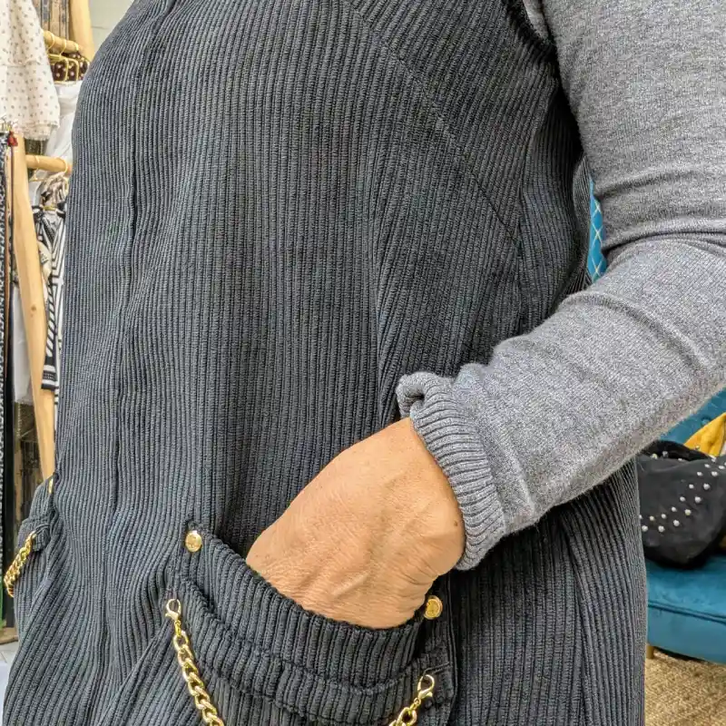 La robe se distingue par son col en V, qui met en valeur le décolleté tout en restant chic. Sa coupe évasée flatte la silhouette, permettant une liberté de mouvement tout en offrant un style raffiné. Les deux poches plates à l’avant ajoutent non seulement une touche pratique, mais elles sont également rehaussées d’une chaînette dorée qui s’étend d’un bout à l’autre de chaque poche. Ce détail unique apporte une note de brillance et de modernité à la robe, faisant d’elle un choix parfait pour celles qui aiment se démarquer.