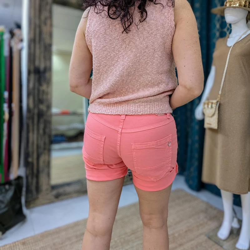 Le mélange de coton et d’élasthanne garantit un confort optimal tout au long de la journée. Ce short est non seulement agréable à porter, mais il est également facile à assortir avec divers tops, que ce soit un t-shirt basique ou une blouse élégante. Son coloris rose/pêche apportera une note de gaieté à votre look, tout en restant chic et raffiné.