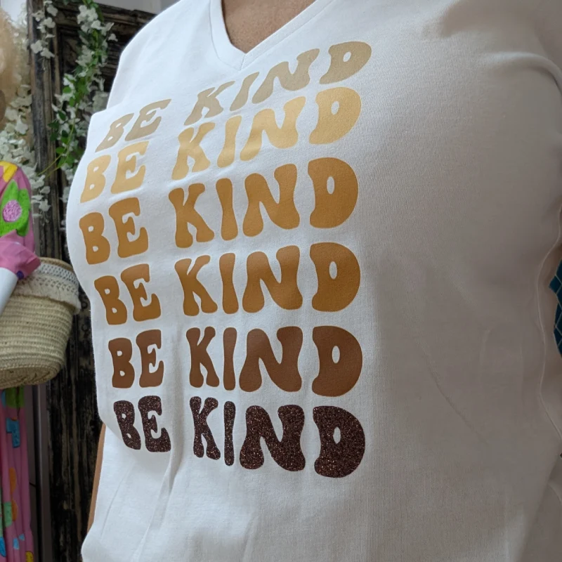 L’élément central de ce t-shirt est sa série d’inscriptions « BE KIND », qui se superposent les unes aux autres dans un dégradé de couleurs. Le premier mot est en vert très clair, apportant une touche de fraîcheur. Le deuxième est en jaune clair, évoquant la chaleur et la positivité. Les troisième, quatrième et cinquième mots sont dans des tons de camel et marron clair, ajoutant une profondeur visuelle. Enfin, le dernier mot, en chocolat pailleté, apporte une note de brillance et d’élégance, rendant ce t-shirt encore plus attrayant.