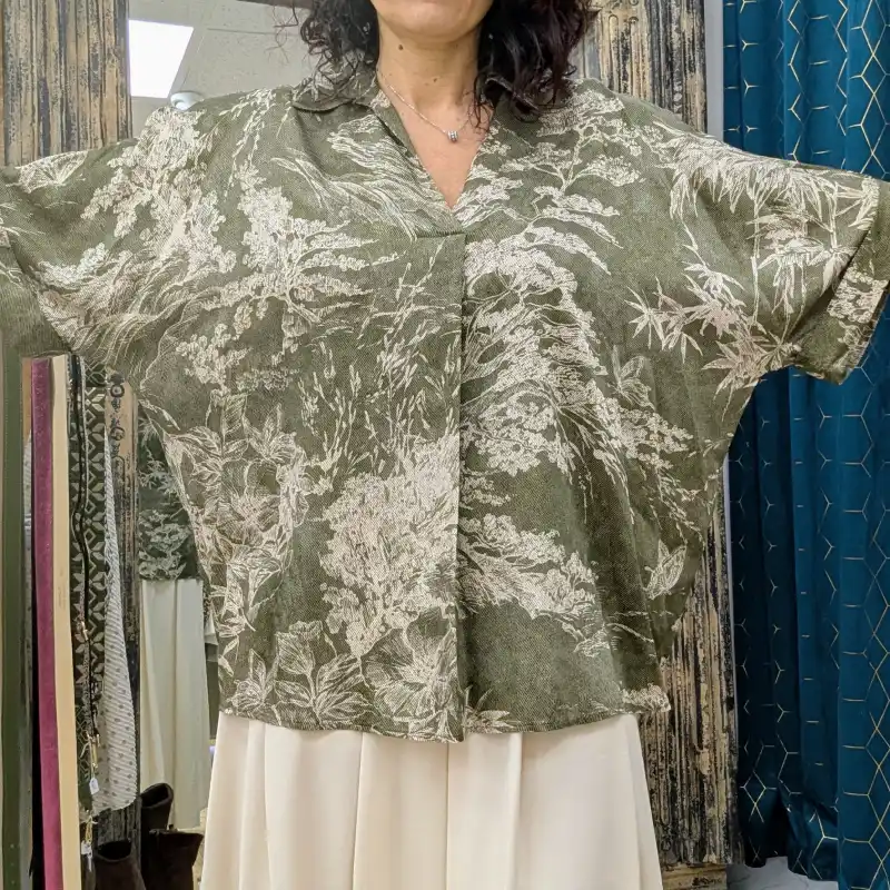 La couleur kaki de la tunique évoque une connexion avec la nature, tandis que les imprimés d’arbres et de papillons en beige clair apportent une note douce et poétique. Ces motifs inspirés de la nature sont non seulement esthétiques, mais ils reflètent également un engagement envers un style de vie respectueux de l’environnement. En portant cette tunique, vous faites le choix d’un vêtement qui célèbre la beauté de la nature tout en restant à la pointe de la mode.