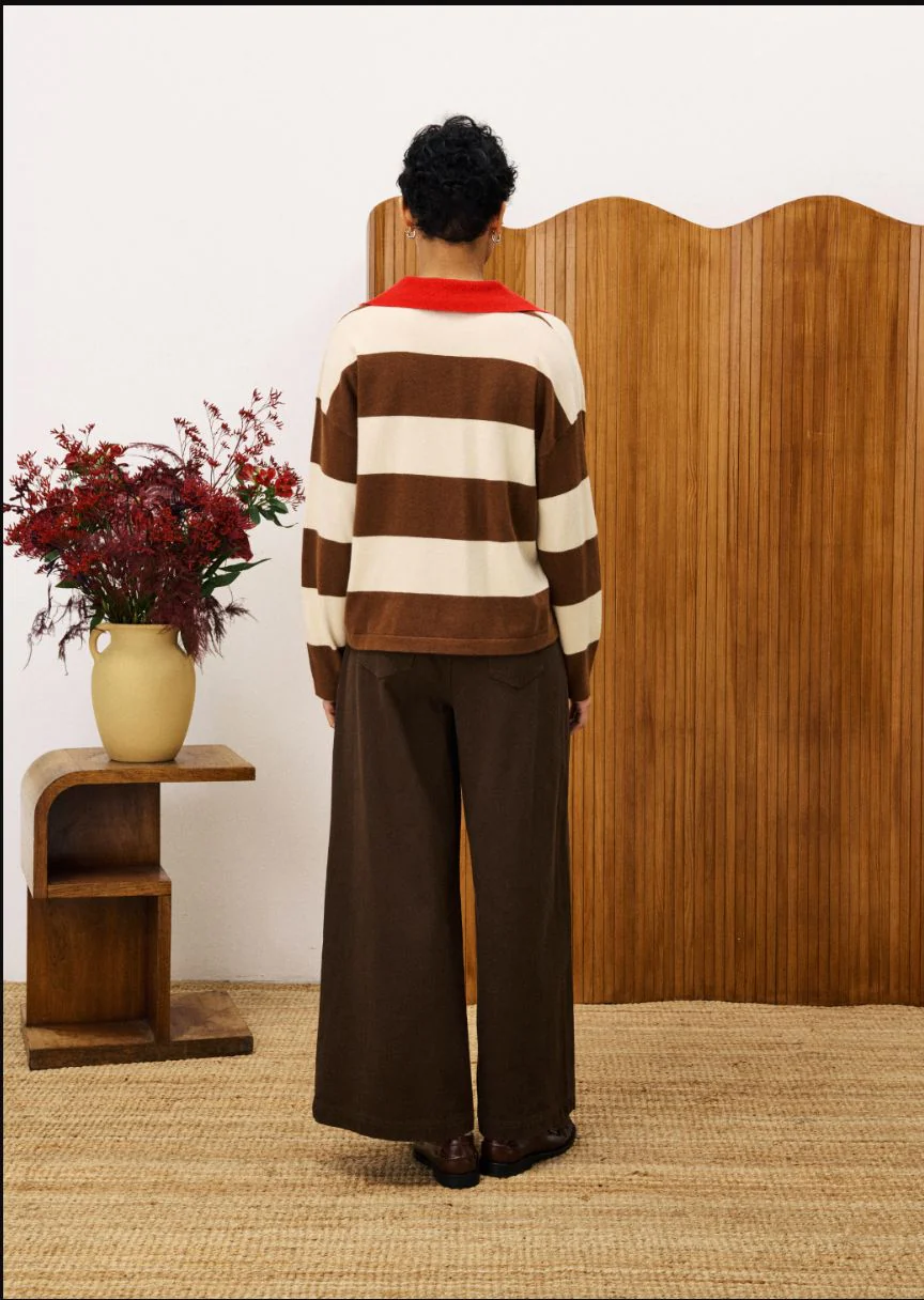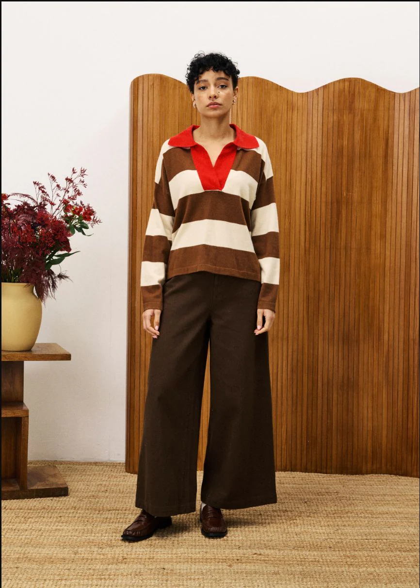Pull polo rayé. Coupe droite légèrement loose. Col polo ouvert contrasté. Rayures larges. Manches longues. Maille douce en coton mélangé. Un twist rétro-sportif.