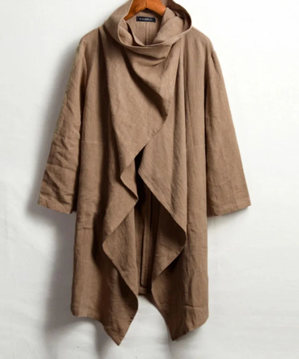 À mi chemin entre une veste et une écharpe unie du même style, ce qui le rend si unique et original est sa façon d’être confectionné en tant que poncho revisité avec une écharpe évasée mais habillée, des manches longues jusqu’au poignet ainsi qu’une partie couvrante jusqu’au bas du dos tel un manteau, alors que le devant laisse entrevoir votre pull ou T-shirt préféré si vous le portez au-dessous.