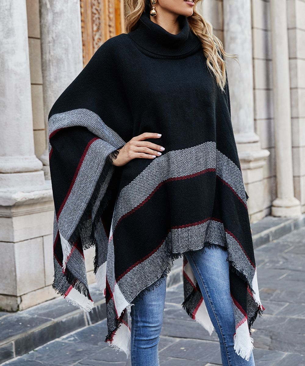 La combinaison du noir, avec les lignes grises et rouges qui parcourent ce haut féminin, crée une harmonie entre le style urbain moderne, et le style vintage. Fabriqué en coton doux et chaud, ce poncho offre un sentiment de douceur et est agréable à porter. Le haut idéal pour un usage journalier dans les moments frais ! Les lignes qu’il contient offrent une subtile touche colorée, apportant à la fois dynamisme et modernité à ce poncho col boule. Sa longueur généreuse donne une belle allure.