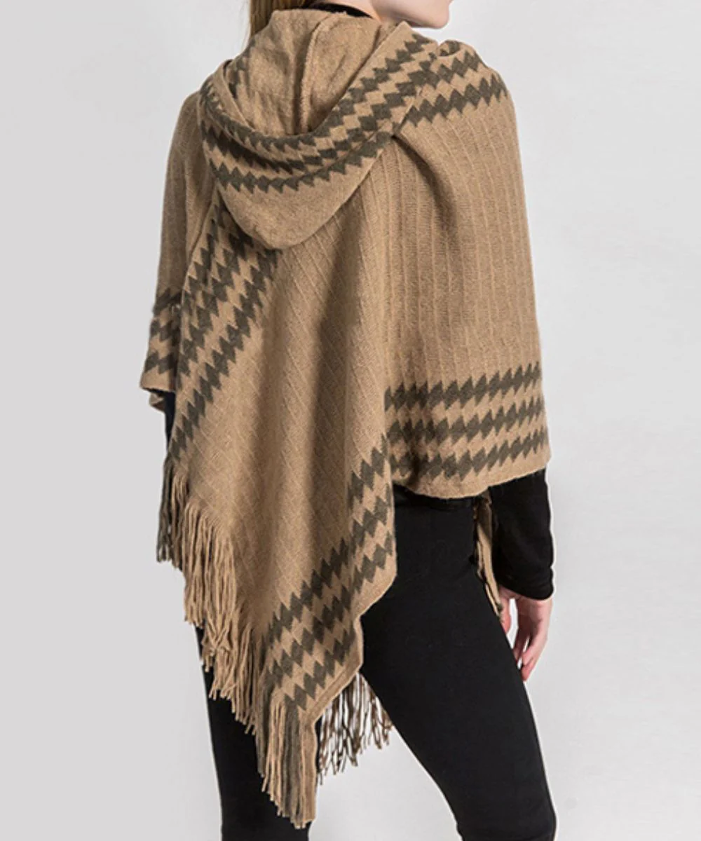 Notre poncho femme couleur marron clair est muni d’une capuche décorative !