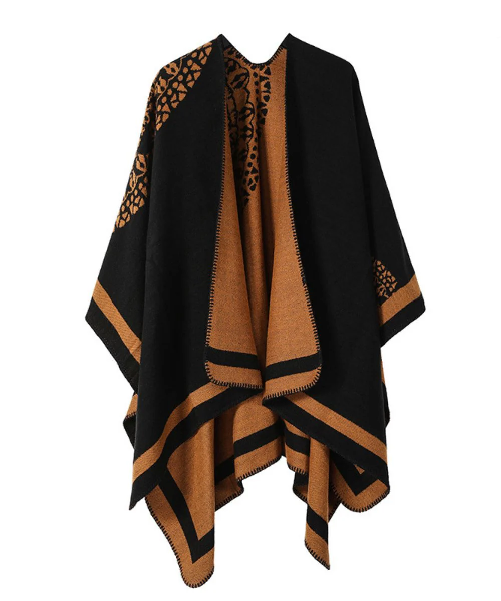 C’est un poncho de confection ample et bicolore avec de beaux motifs imprimés en acrylique !