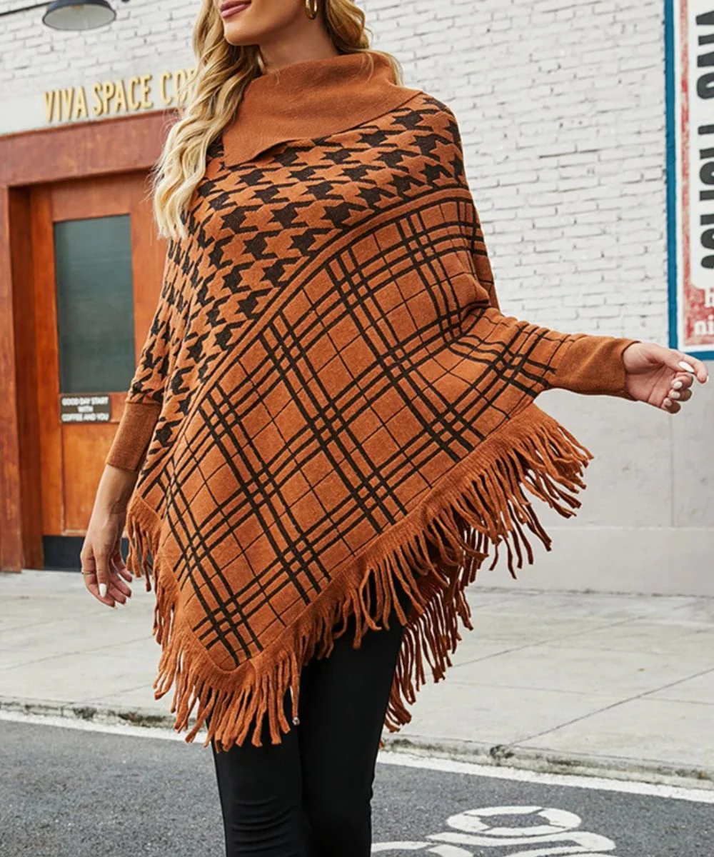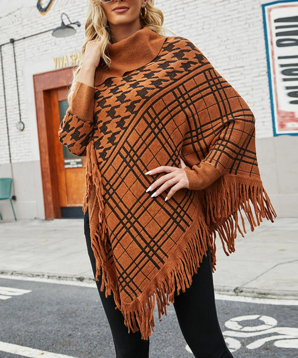 Sa couleur camel est magnifique, et offre un look décontracté tout en étant des plus chics. Bien mieux qu’un manteau long, ce poncho permet à vos mains de pouvoir réaliser de grands mouvements, comme par exemple si vous désirez attraper quelque chose. La sensation de flottaison et de liberté tout en ayant un vêtement protecteur sur le dos est l’une des meilleures sensations qui soient. Il est aussi orné de carreaux noirs.