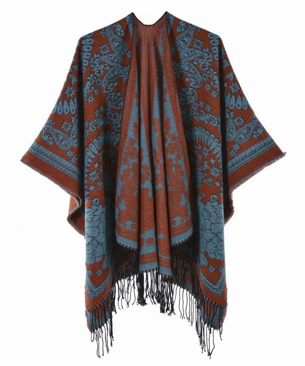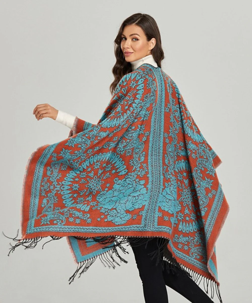 Sa conception ample est munie de franges aux bords du dessous, afin de créer un effet antique des premiers ponchos sud américains. Mais son design oriental rappelle vos vacances en Inde ou les photos du Maharadja ! Ses motifs imprimés à l’acrylique directement sur son textile moderne en polyester arborent des contrastes entre bleu et orange foncé. Sa conception par dessus les épaules en fait un poncho des plus couvrants, ce qui est bien mieux qu’une écharpe ou une cape, parce qu’il est plus maniable, vous permet une grande liberté de mouvements, et surtout un style original et plein de charme tout en vous réchauffant ! Il est disponible en trois coloris pour varier les plaisirs, aussi originaux les uns que les autres.