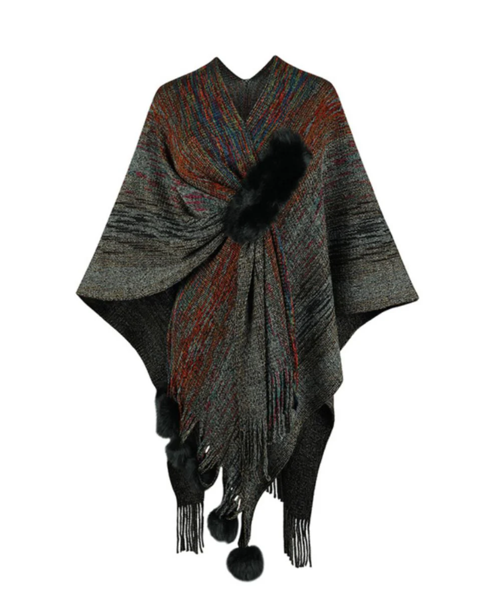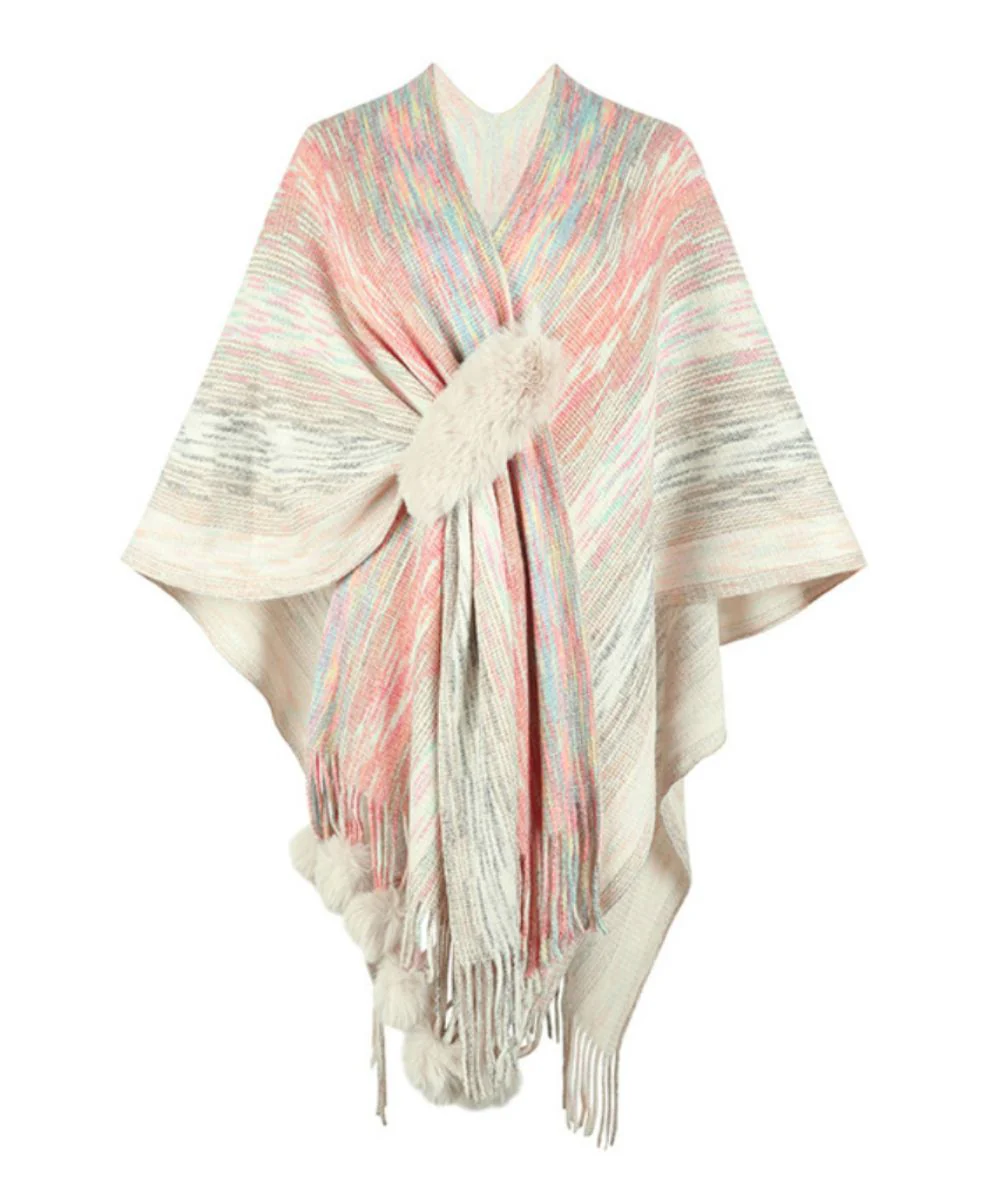 Notre modèle, introuvable en boutique de prêt-à-porter, vous vaudra à coup sûr de beaux compliments et saura sublimer n’importe quelle jupe courte ou pantalon de ville. Disponible en trois couleurs, rose blanc et noir, notre poncho est également recouvert de fausse fourrure en pompon aux extrémités et au niveau du ventre.