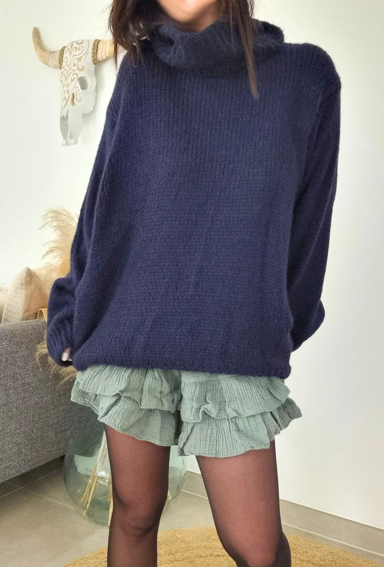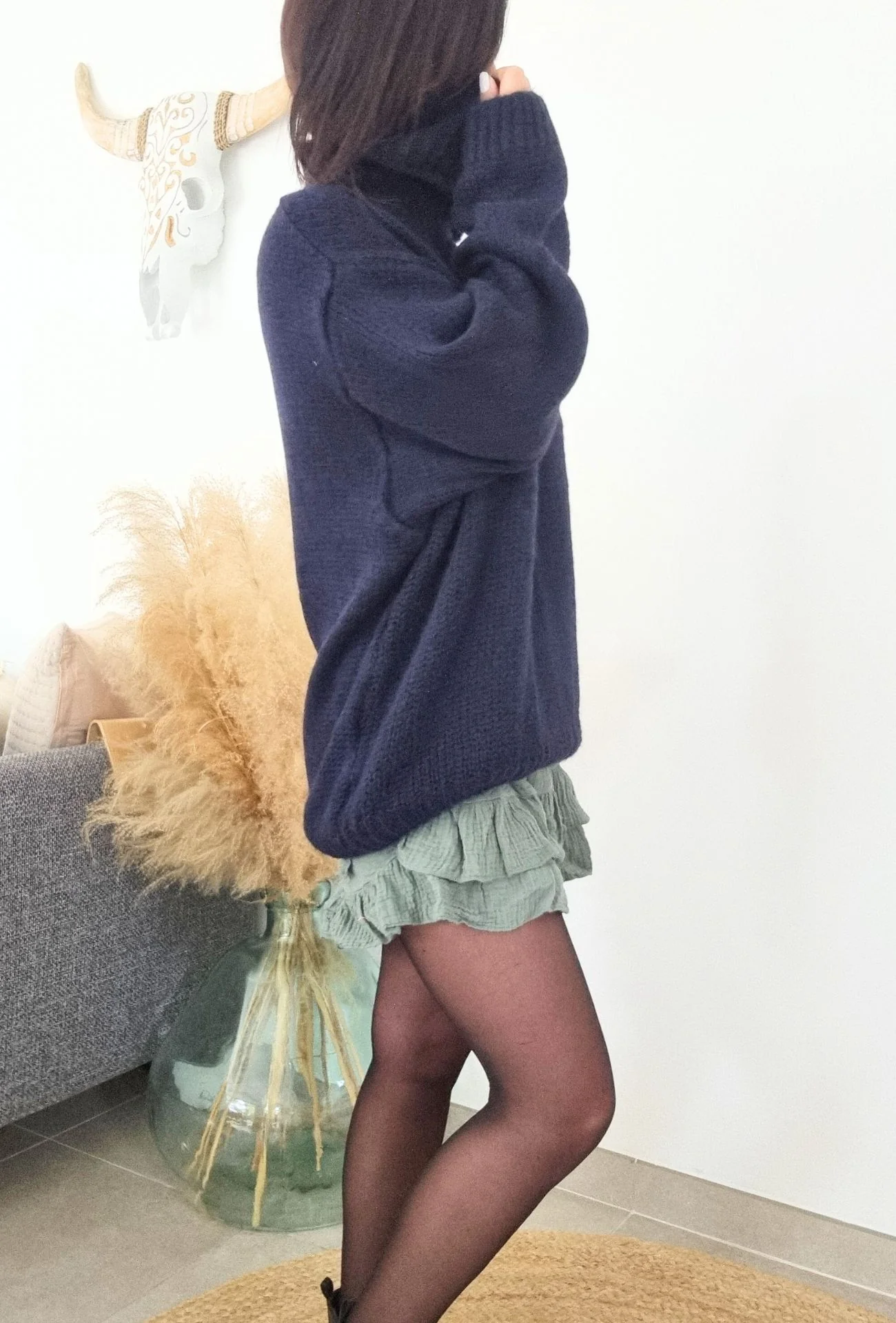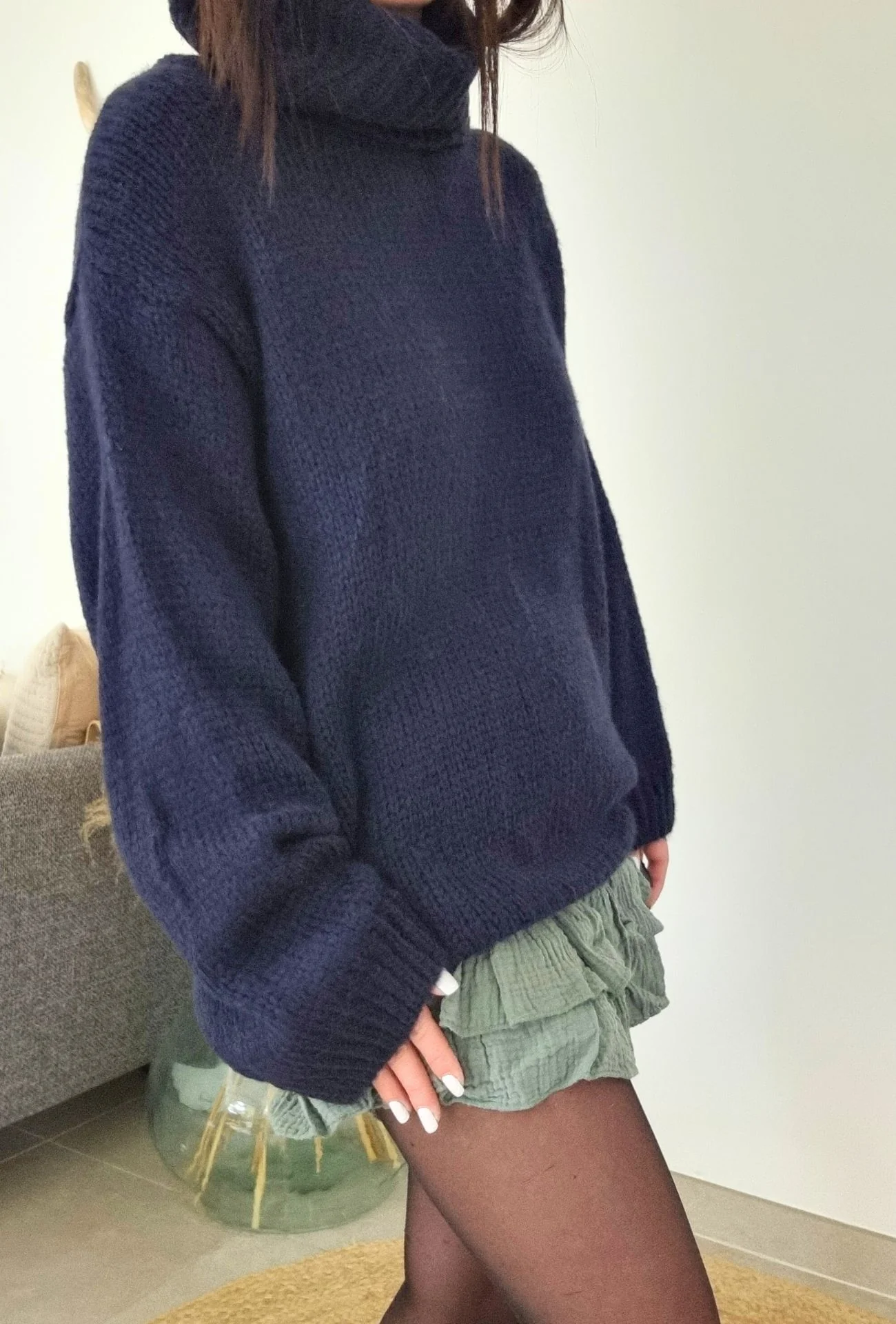 Adoptez l’élégance et le confort avec le pull AMANDINE en bleu marine. Sa coupe oversize et son col roulé douillet offrent un style décontracté et une chaleur enveloppante. Ses manches bouffantes et ses finitions côtelées apportent une touche de modernité à ce pull classique revisité. La teinte bleu marine, profonde et sophistiquée, s’associe facilement avec vos tenues préférées pour une allure intemporelle et chic.