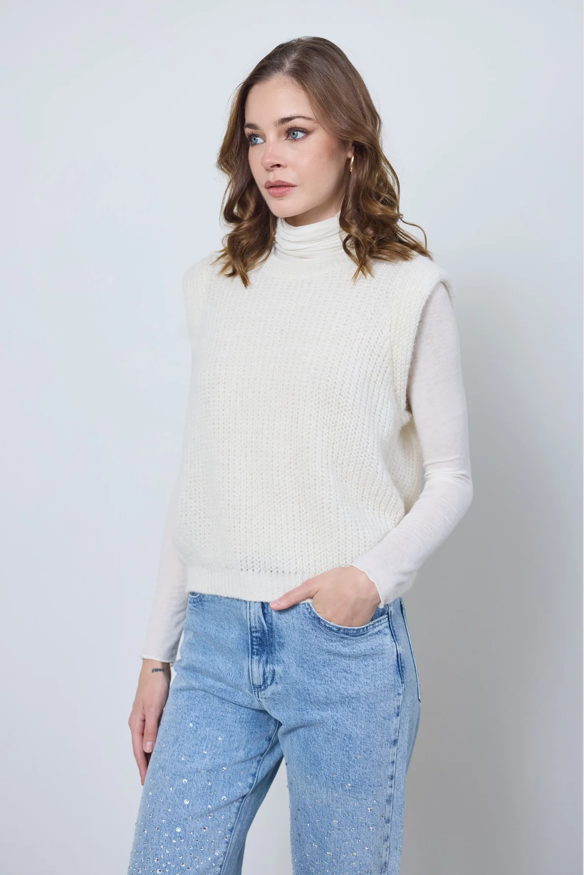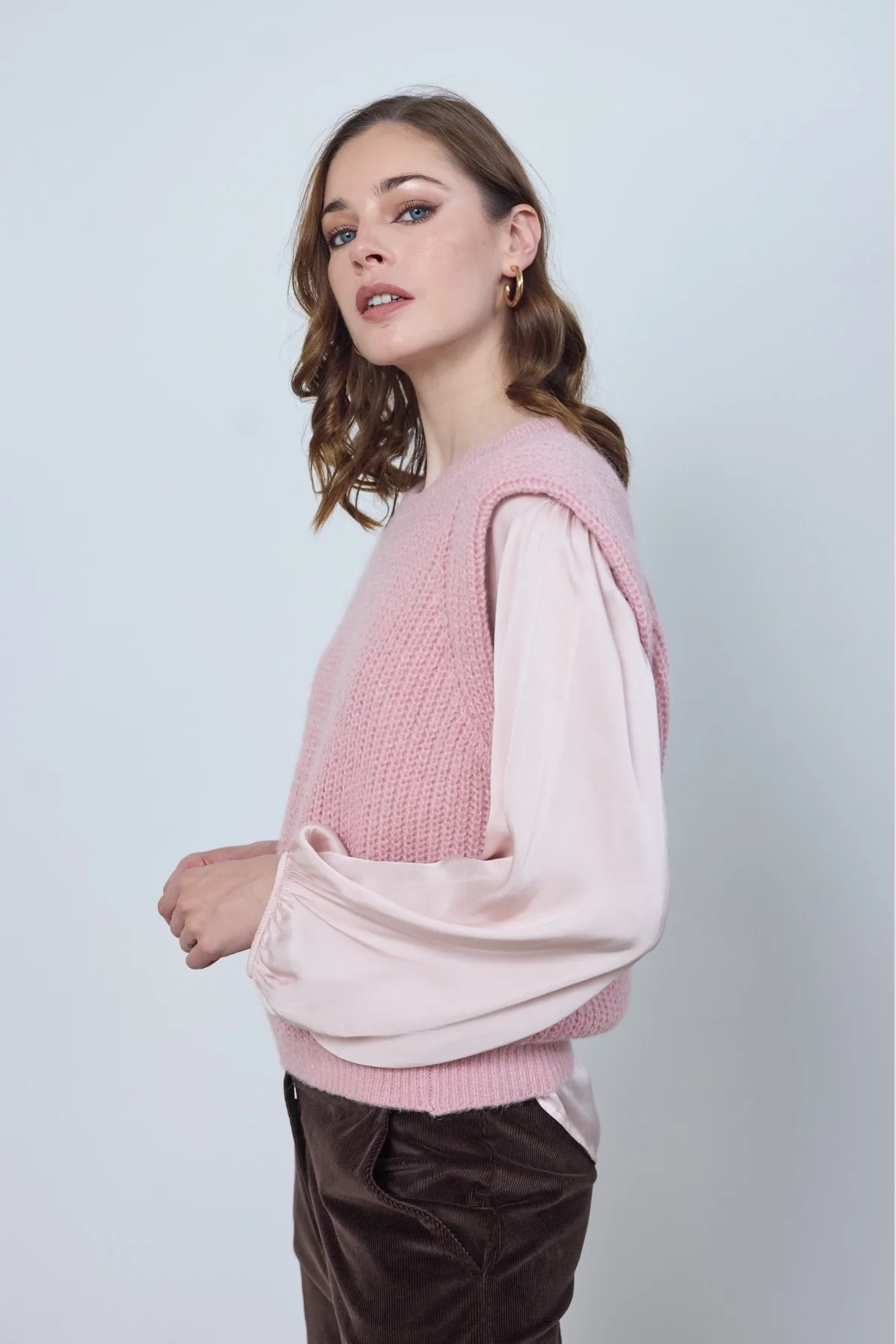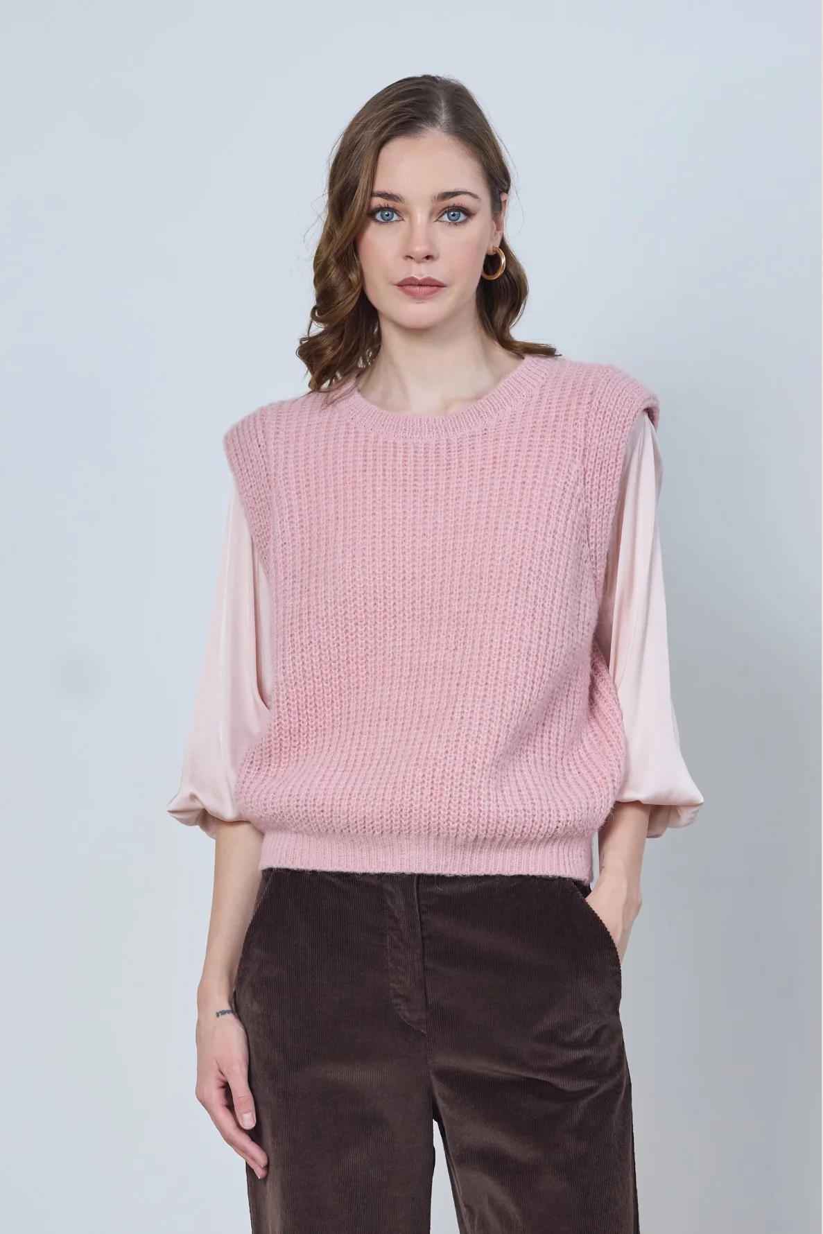 Le pull Audrey, sans manches et à col rond, allie simplicité et confort. Minimaliste et versatile, il se porte seul ou en superposition pour un look élégant et épuré.