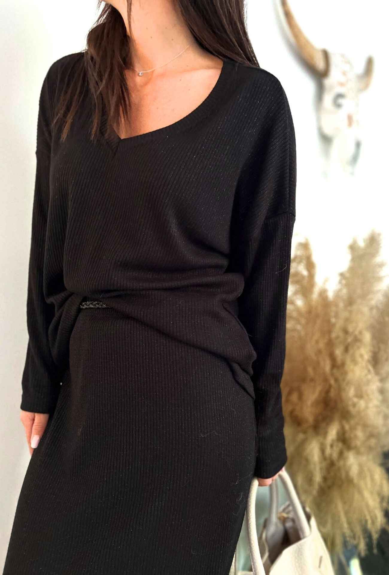 Le pull KARINE en noir incarne l’élégance intemporelle et le confort moderne. Avec sa coupe fluide et son col en V flatteur, il apporte une allure cosy-chic à toutes vos tenues. Sa maille côtelée, subtilement rehaussée par des touches de lurex, ajoute un éclat discret et raffiné. Idéal pour la mi-saison ou les journées fraîches, il allie douceur et modernité pour un style polyvalent et sophistiqué.