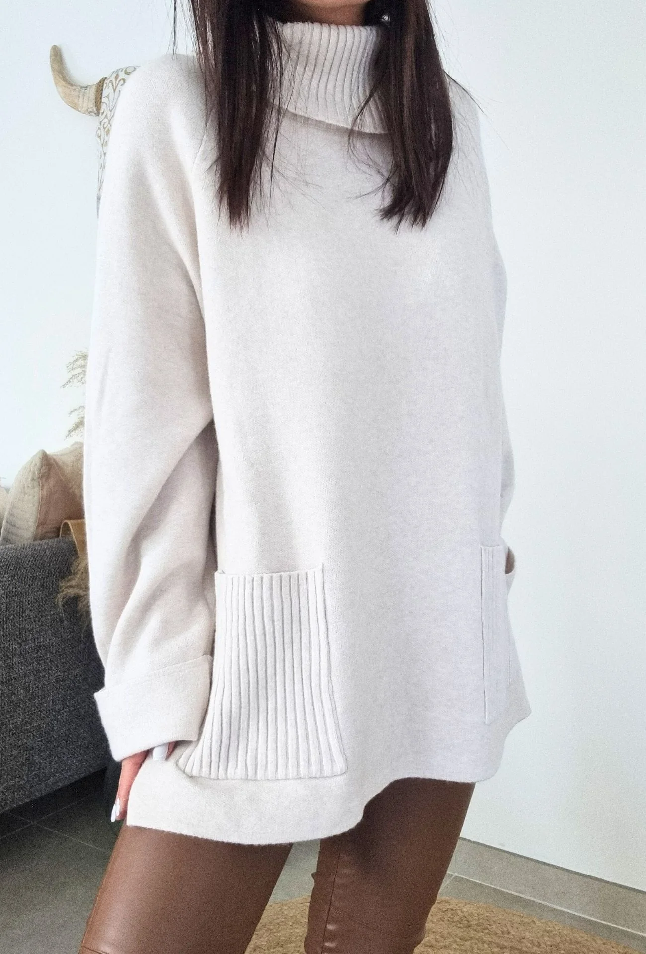 Adoptez l’élégance intemporelle avec le pull KIKO en beige, parfait pour affronter les journées fraîches avec style. Sa coupe ample et son col roulé généreux offrent un confort inégalé, tandis que les poches plaquées en maille côtelée et les boutons dorés sur les manches viennent sublimer ce basique revisité. Sa teinte beige douce et polyvalente s’associe facilement à toutes vos pièces favorites pour un look chic et décontracté.