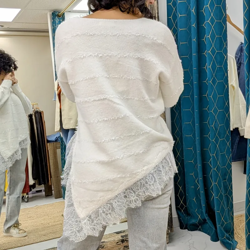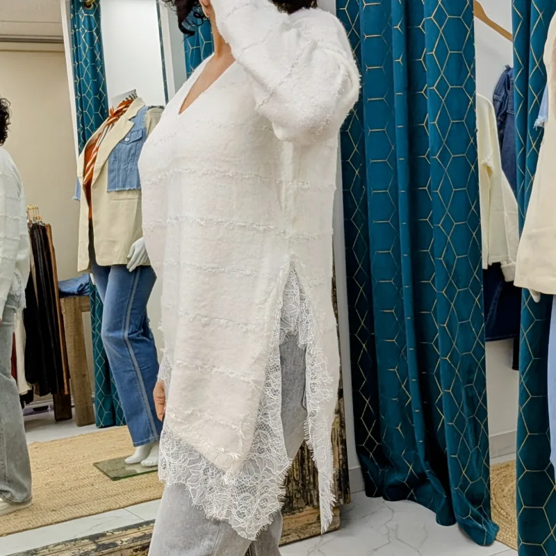 Le bas du pull est orné de délicates dentelles, ajoutant une touche féminine et élégante à l’ensemble. Ce détail raffiné fait toute la différence, transformant un simple pull en une pièce maîtresse de votre tenue. Que vous le portiez avec un jean décontracté pour une sortie entre amis ou avec une jupe pour une occasion plus habillée, ce pull saura s’adapter à toutes les situations.