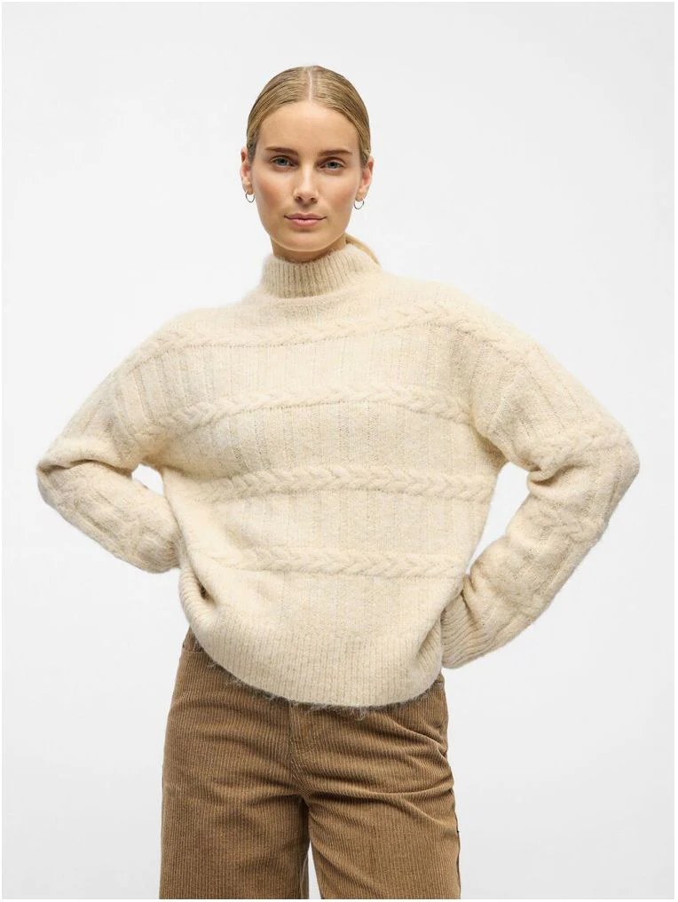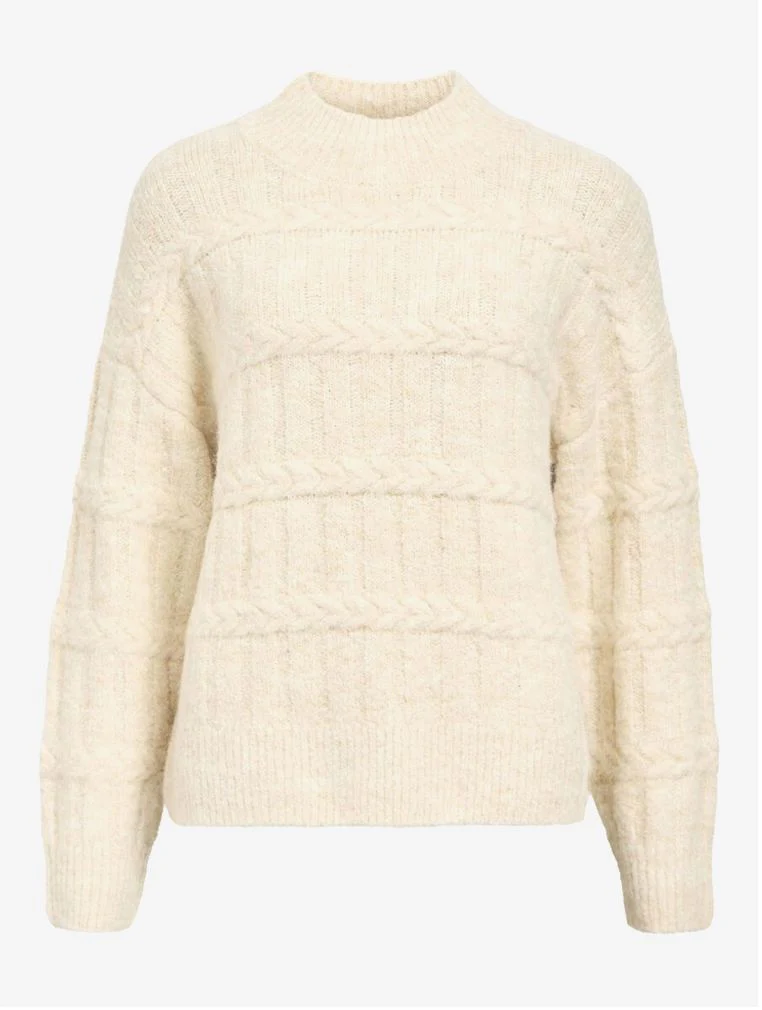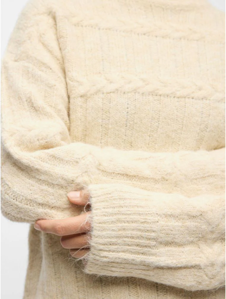 Pull en maille torsadée. Col montant. Épaules tombantes. Manches longues. Bordures côtelées.