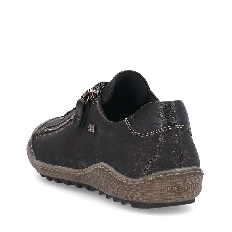 Sneaker Remonte noir multi pour femme élégant, le modèle R1402-07, marie style sport-chic, confort supérieur et protection contre les intempéries. Sa finition texturée noir multi aux reflets bronze apporte une touche sophistiquée et originale. Grâce à la membrane imperméable Remonte Tex, vos pieds restent bien au sec tout en profitant d’une respirabilité optimale, même lors des journées plus actives.