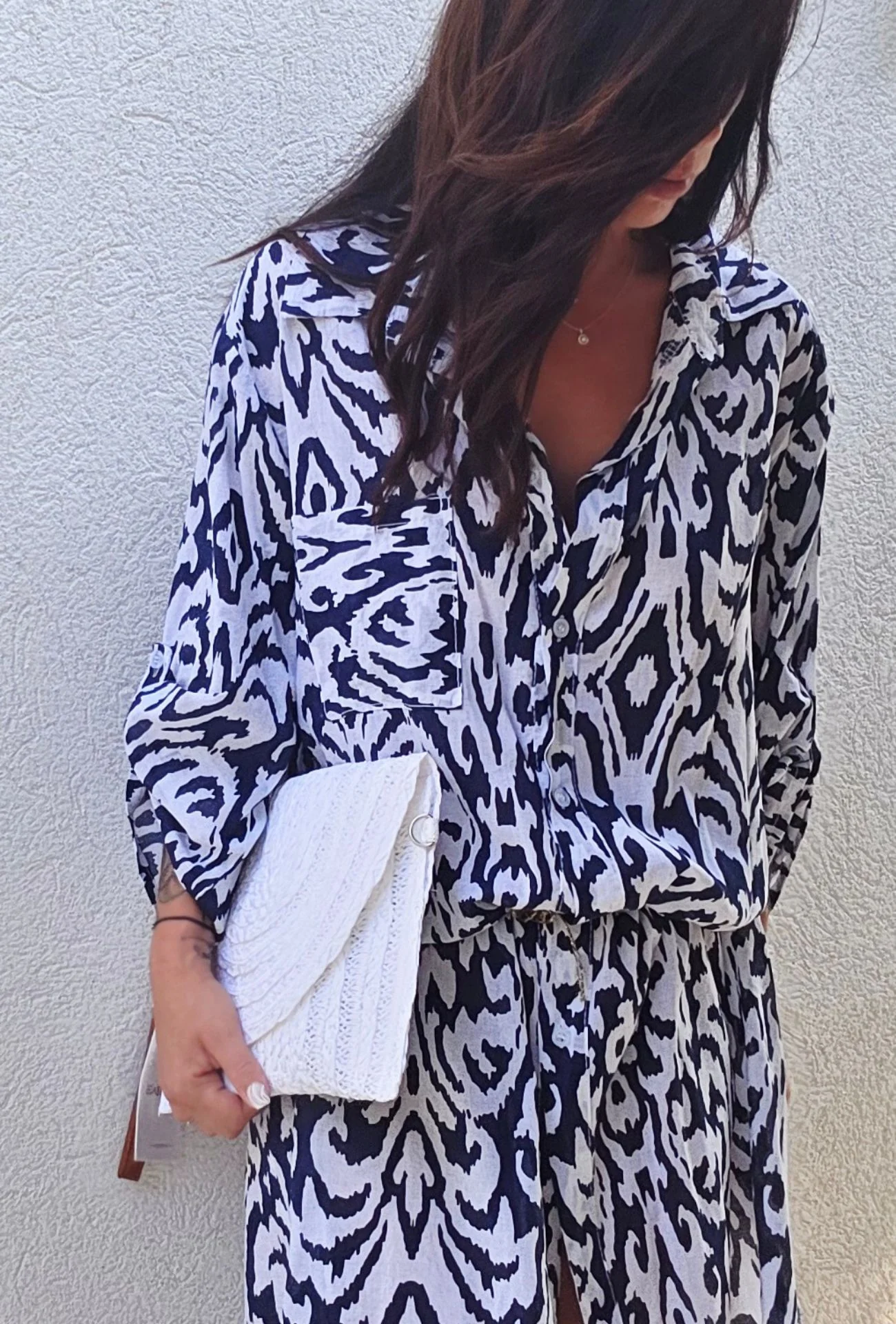 Captez tous les regards avec la robe chemise GAËLLE, au motif ethnique chic en marine et blanc. Cette robe à l’allure décontractée mais sophistiquée est confectionnée dans un mélange doux et respirant de coton et d’élasthanne. Sa coupe oversize et ses manches longues retroussables permettent une grande liberté de mouvement et un confort optimal. Boutonnée sur toute la longueur, elle se porte aussi bien en robe qu’en surchemise pour multiplier les looks. Fabriquée en Italie, elle est la pièce incontournable de la saison.