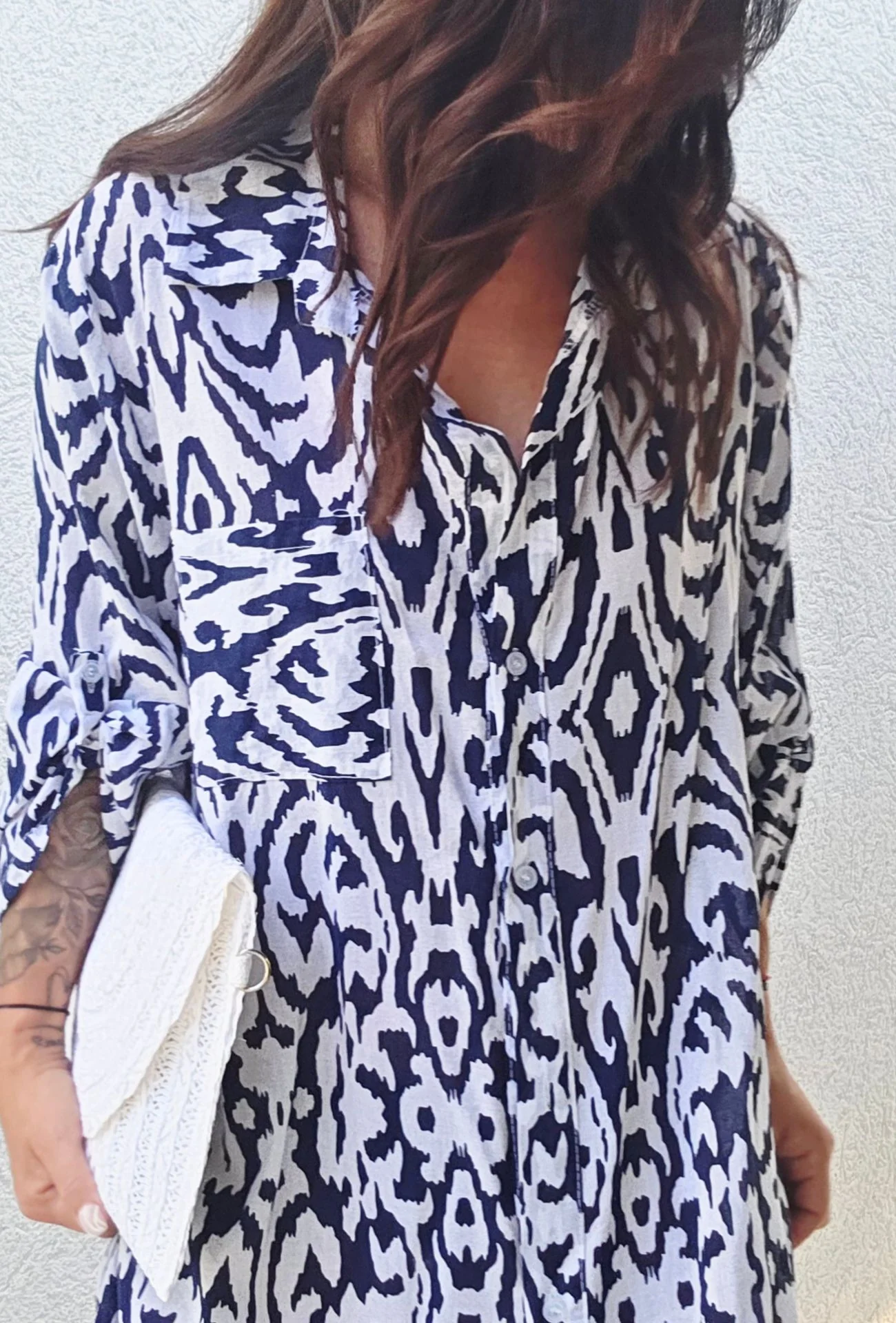 Détails : col chemise, manches longues retroussables, boutons sur toute la longueur, motif ethnique tendance