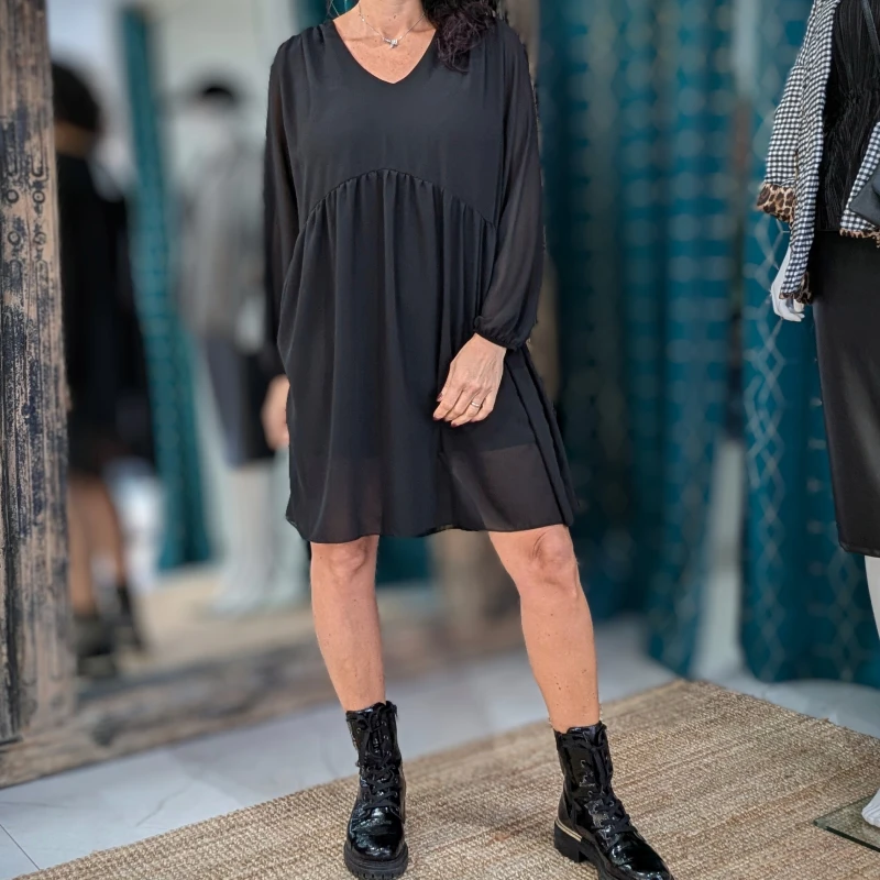 Découvrez notre robe courte en tulle, un incontournable de votre garde-robe. Cette pièce élégante est entièrement doublée, à l’exception de ses manches longues, offrant un confort optimal tout au long de la journée. Avec son col rond large, elle met en valeur le cou tout en restant chic et décontractée.