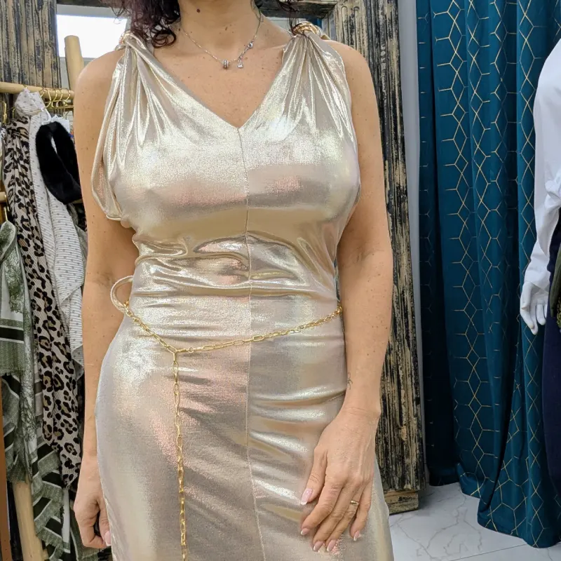 Que vous assistiez à un gala, une soirée entre amis ou un événement formel, cette robe longue dorée/nacrée est un choix parfait. Son design intemporel et ses détails raffinés en font une pièce polyvalente qui peut être accessoirisée de différentes manières. Associez-la à des escarpins dorés et à des bijoux délicats pour un look éblouissant, ou optez pour des sandales plus décontractées pour une allure chic mais décontractée.