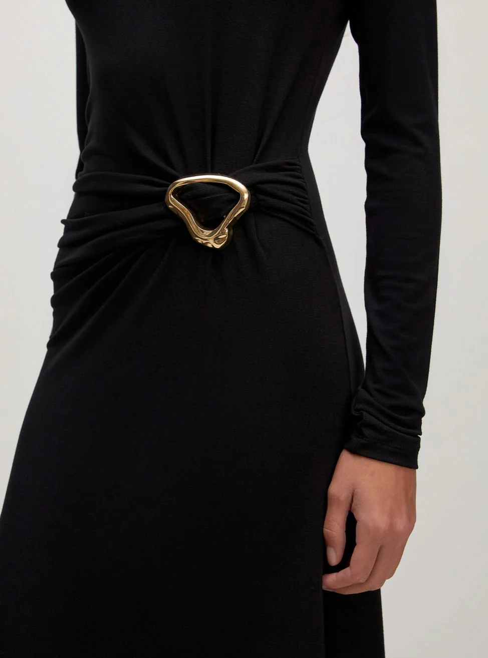 Robe près du corps drapée avec une boucle dorée.