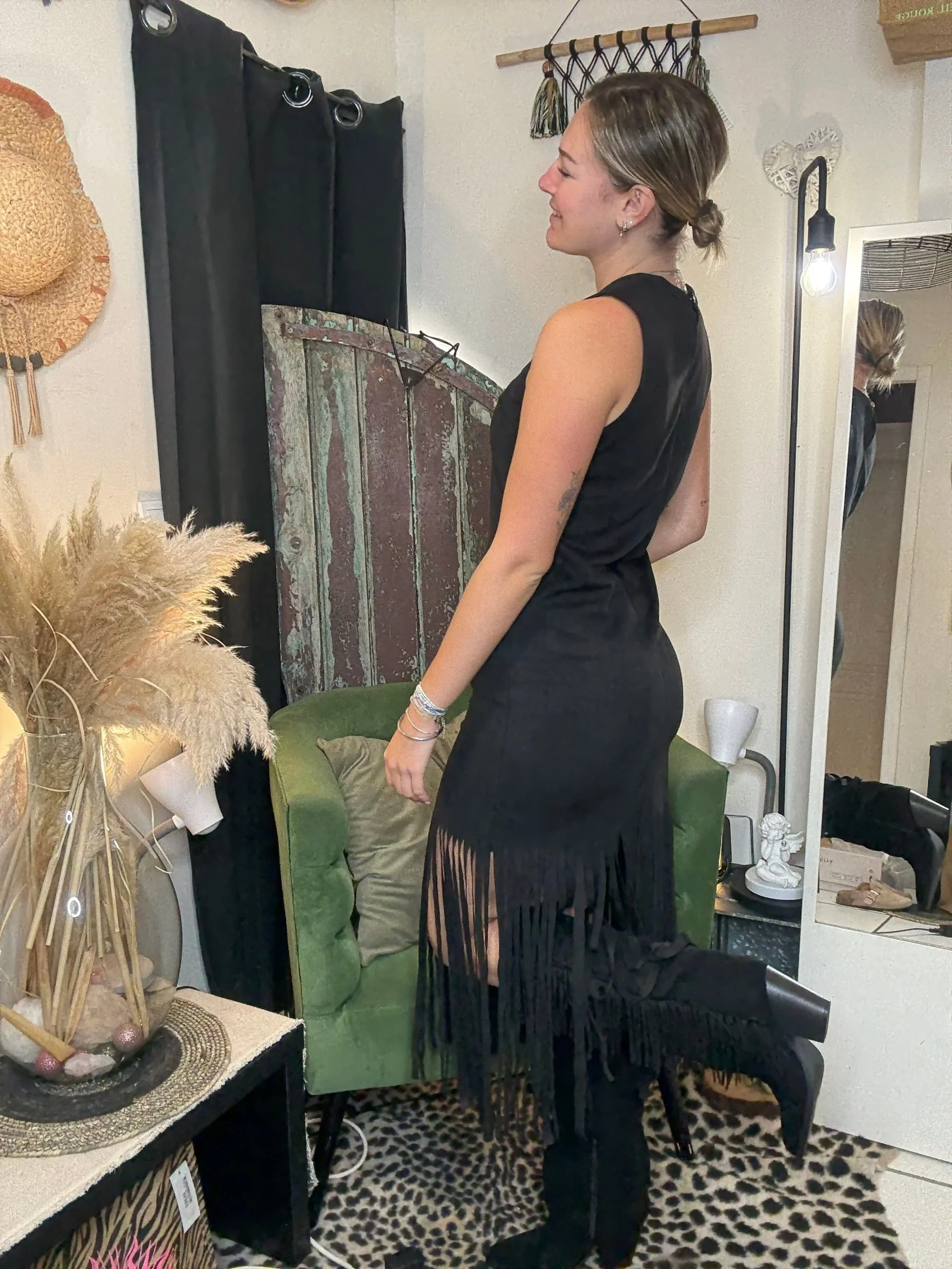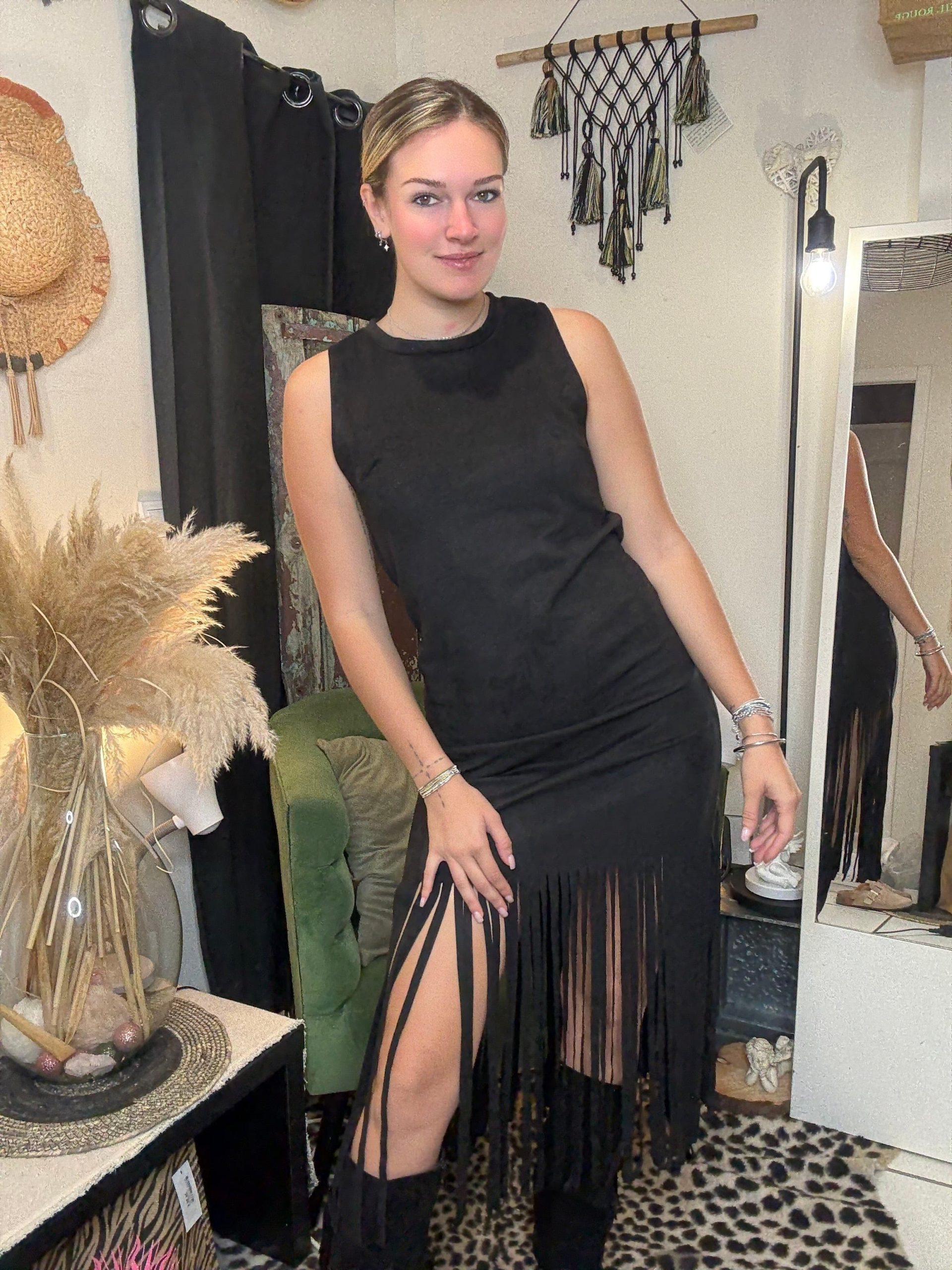 Cette incroyable robe est parfaite pour celles qui veulent être à la fois élégantes et audacieuses. SES franges ajoutent une touche audacieuse à votre look, tandis que sa coupe flatteuse mettra en valeur vos courbes.