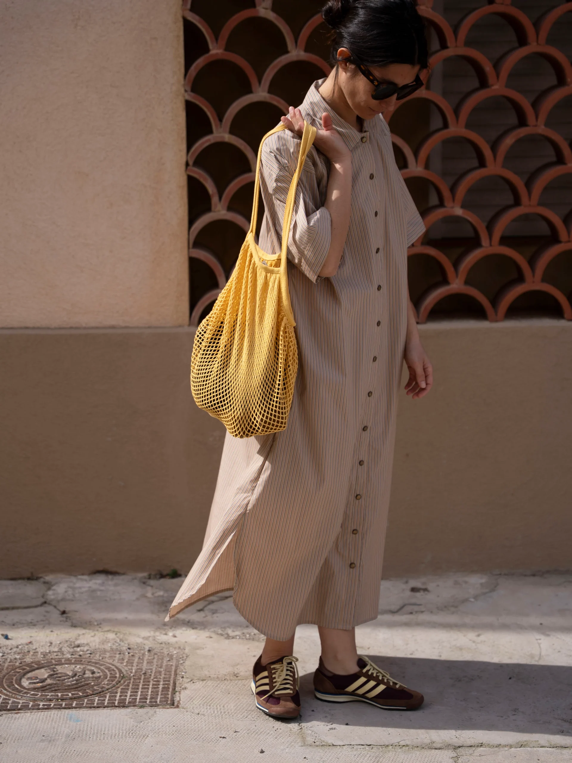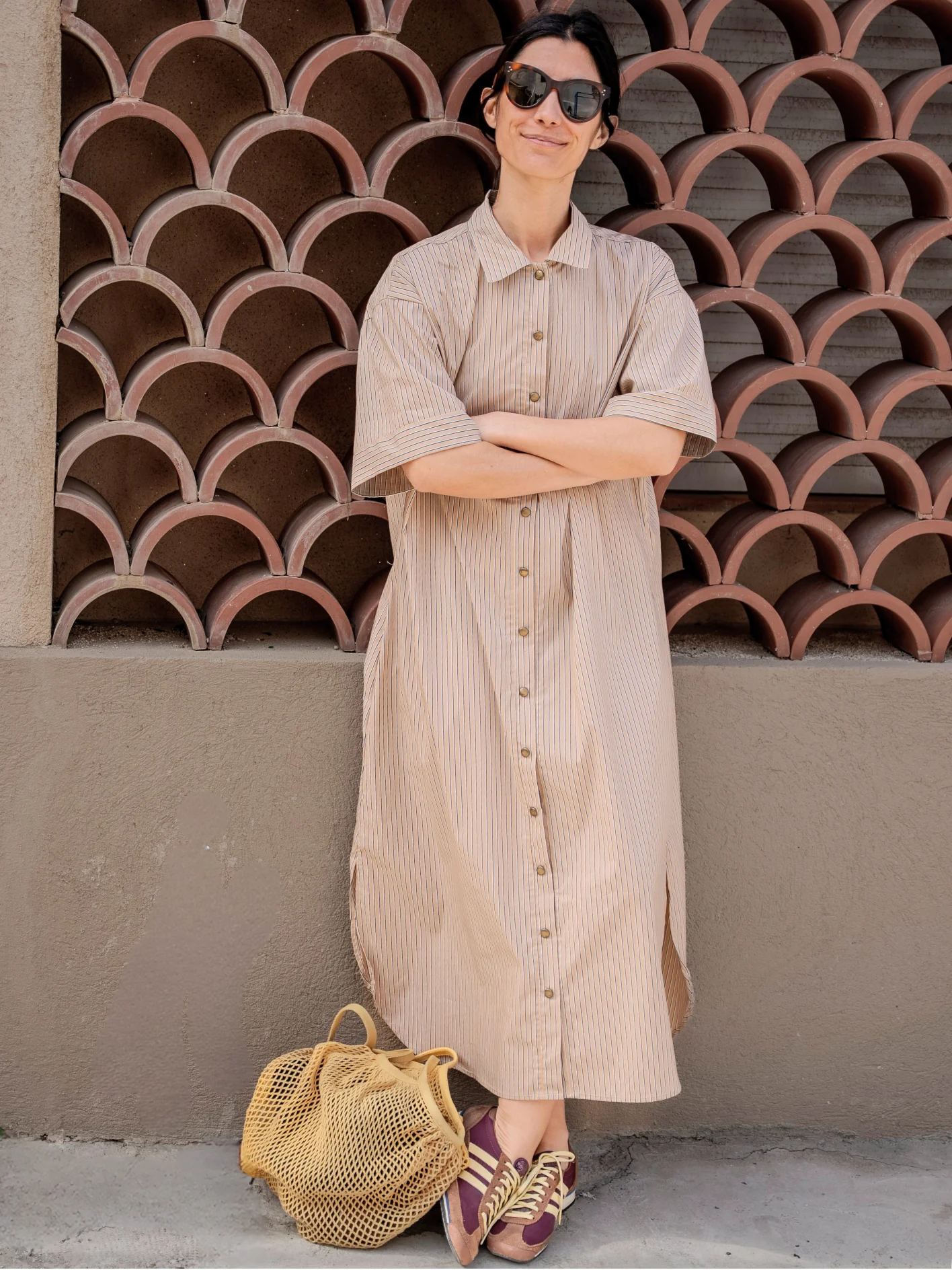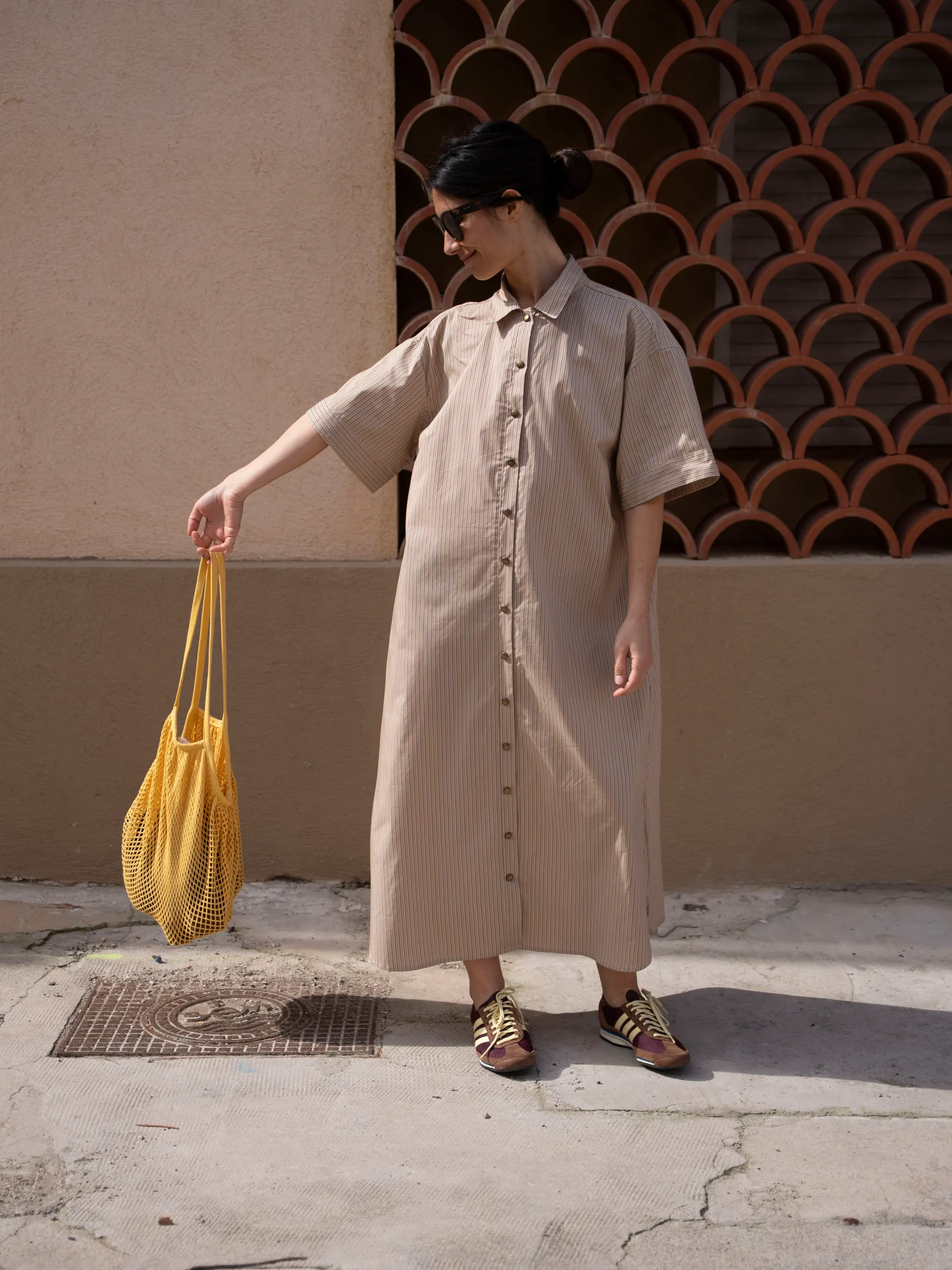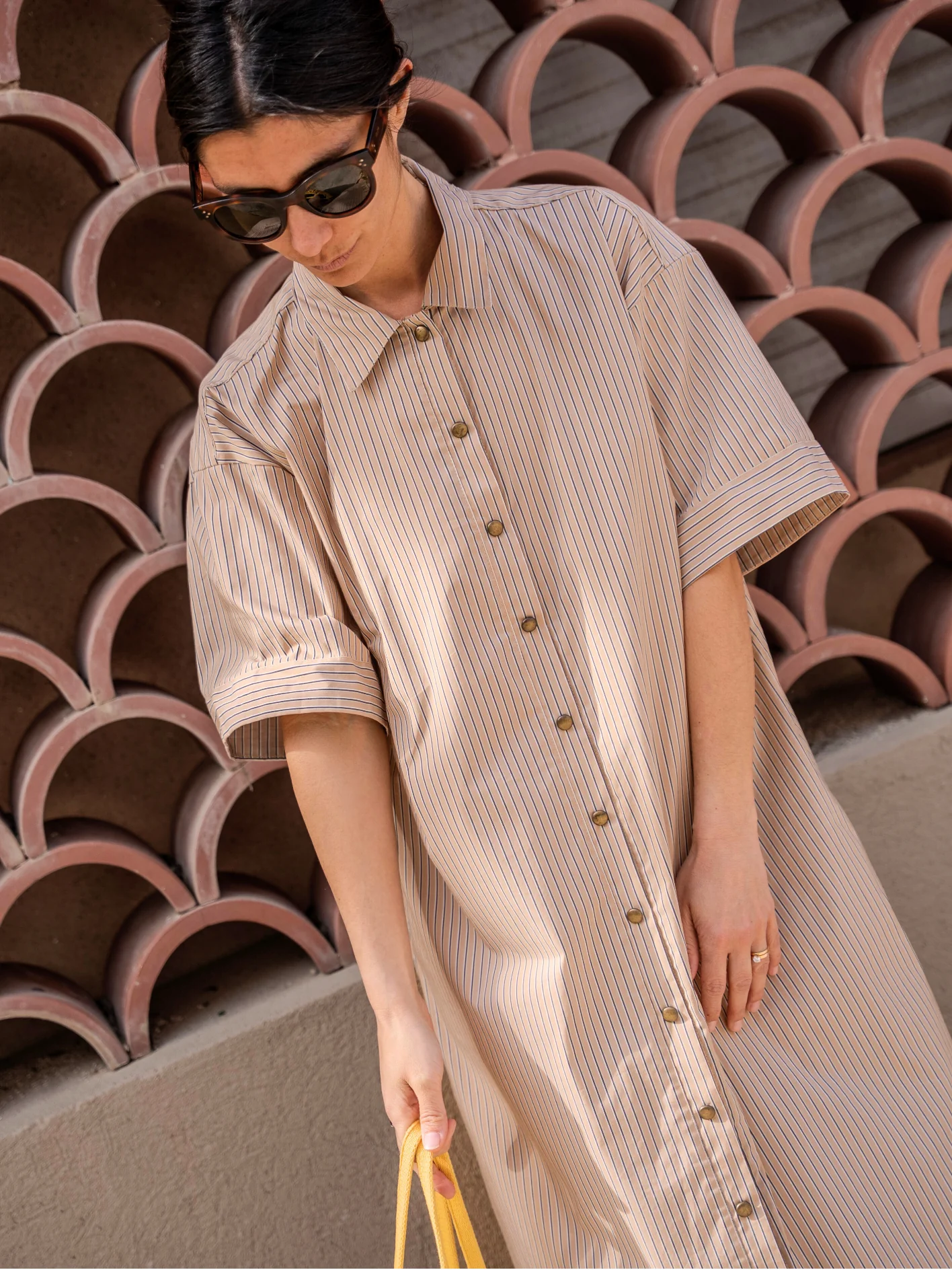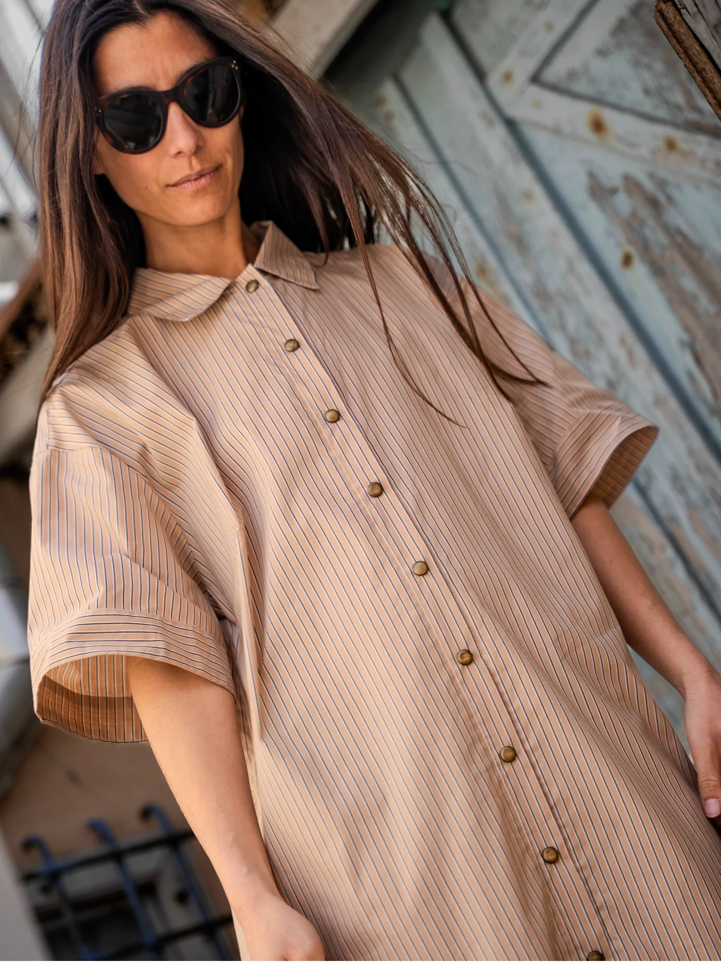 Avec sa coupe ample et sa ligne droite, la robe SIENNE réinvente la chemise longue dans une version à la fois confortable et élégante. Son col classique, ses manches courtes et son boutonnage intégral en font une pièce facile à vivre.