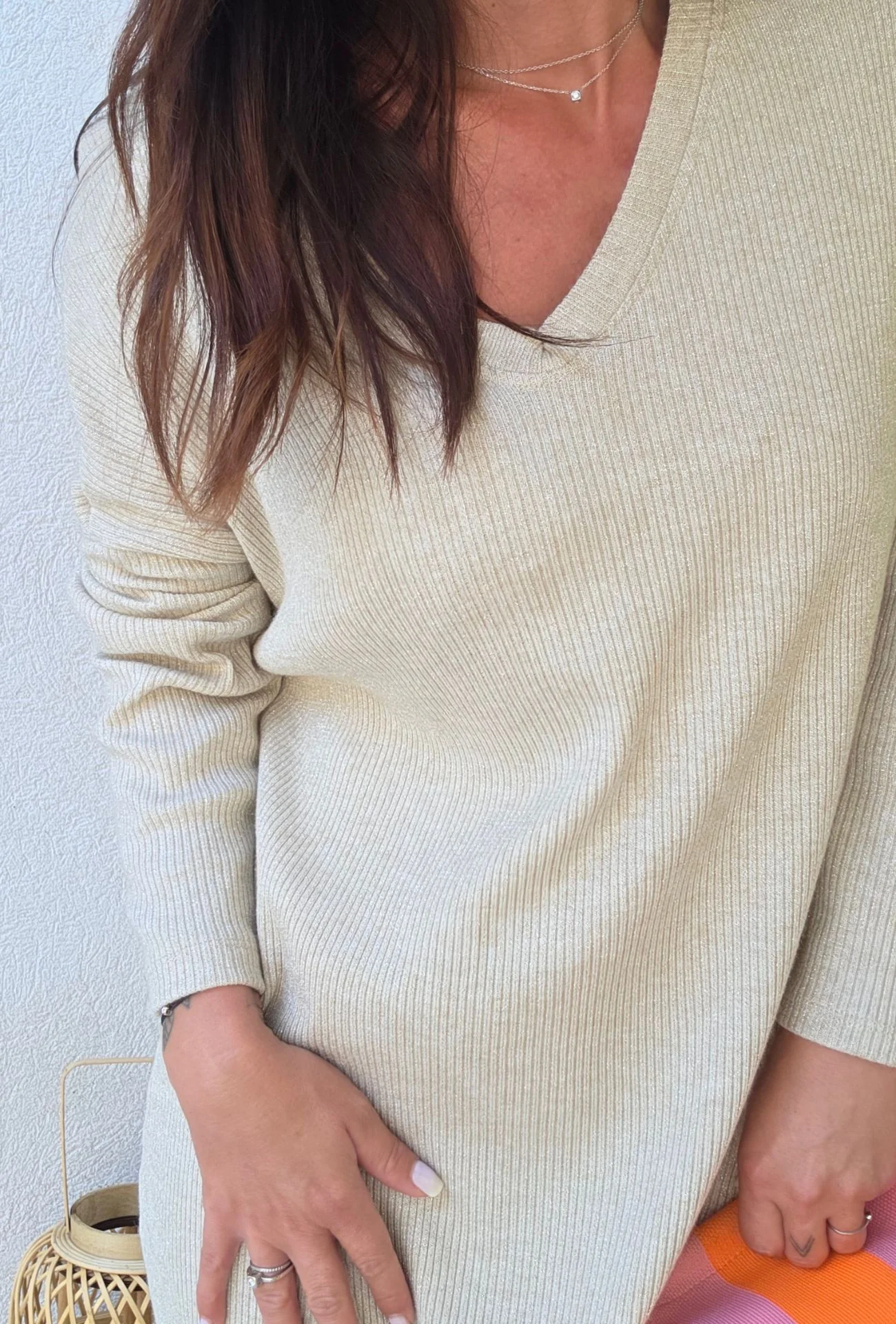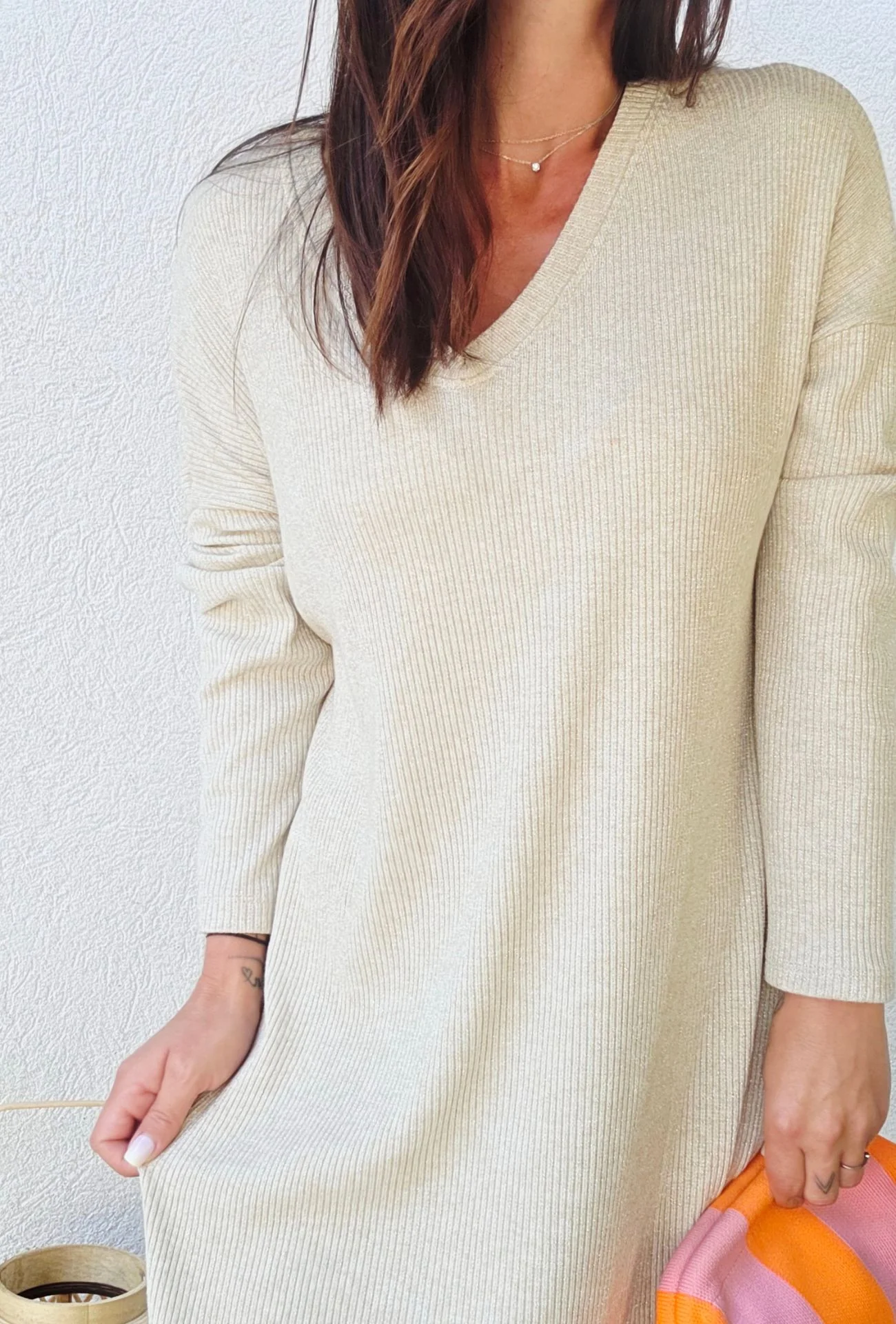 Douce, fluide et lumineuse, la robe maille KARINE sable est la pièce parfaite pour un look effortless chic. Sa maille côtelée au tombé souple épouse subtilement les formes sans les mouler, pour une silhouette féminine et confortable à la fois. Son col en V flatte le décolleté avec délicatesse, tandis que sa teinte sable légèrement irisée capte la lumière à chaque mouvement, pour un rendu élégant en toute simplicité.