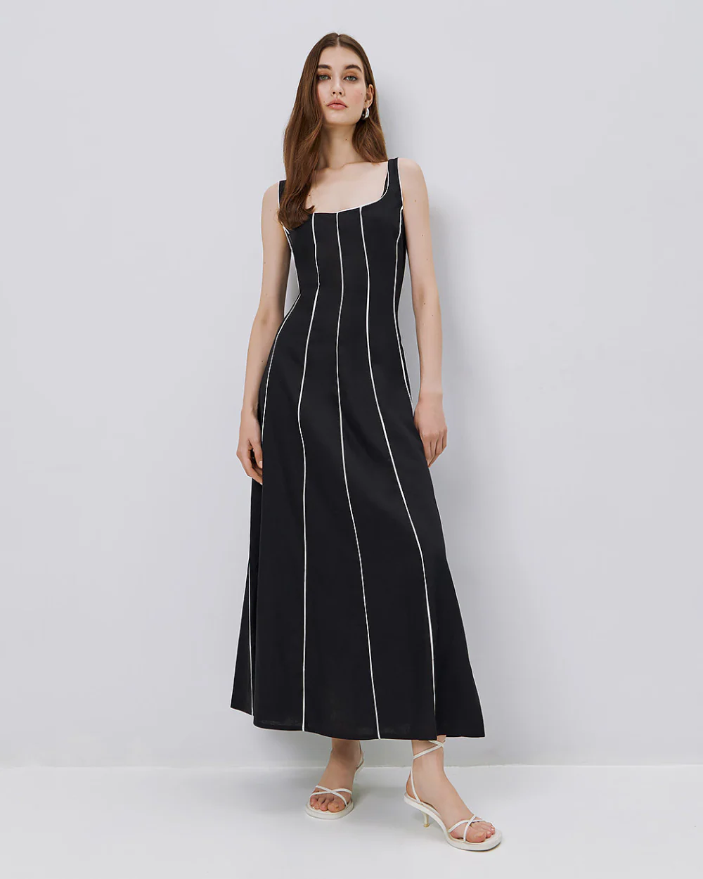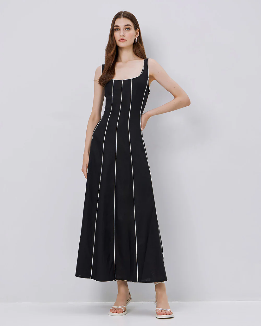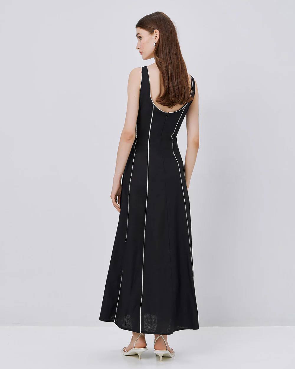 Adoptez un style casual chic sans effort avec cette robe maxi sans manches. Elle séduit par son encolure ronde profonde, son dos arrondi et ses finitions contrastantes qui lui donnent du caractère. Confectionnée dans un mélange de lin et de rayonne, elle assure confort et tenue tout au long de la journée. Idéale pour vos looks estivaux élégants.