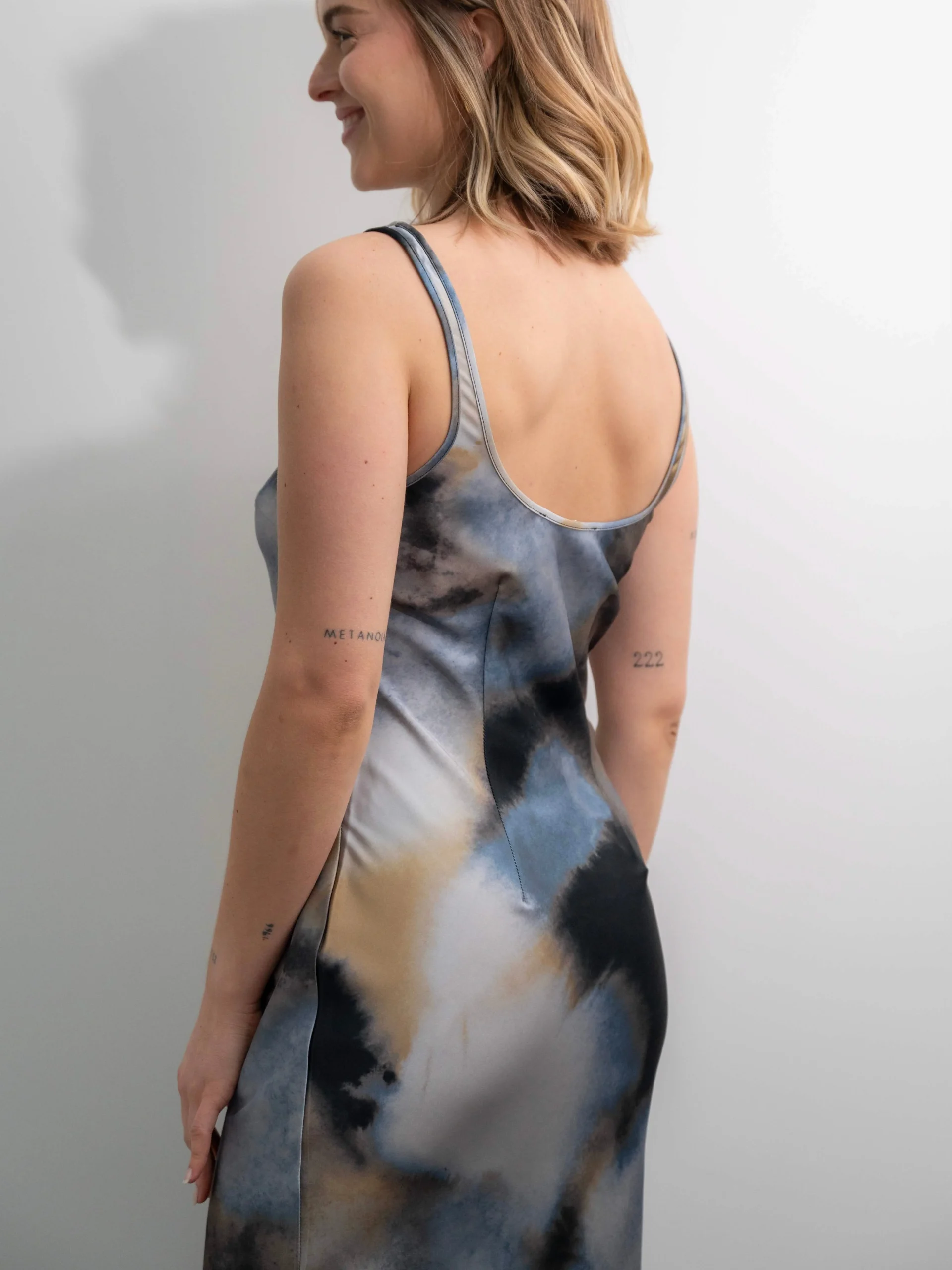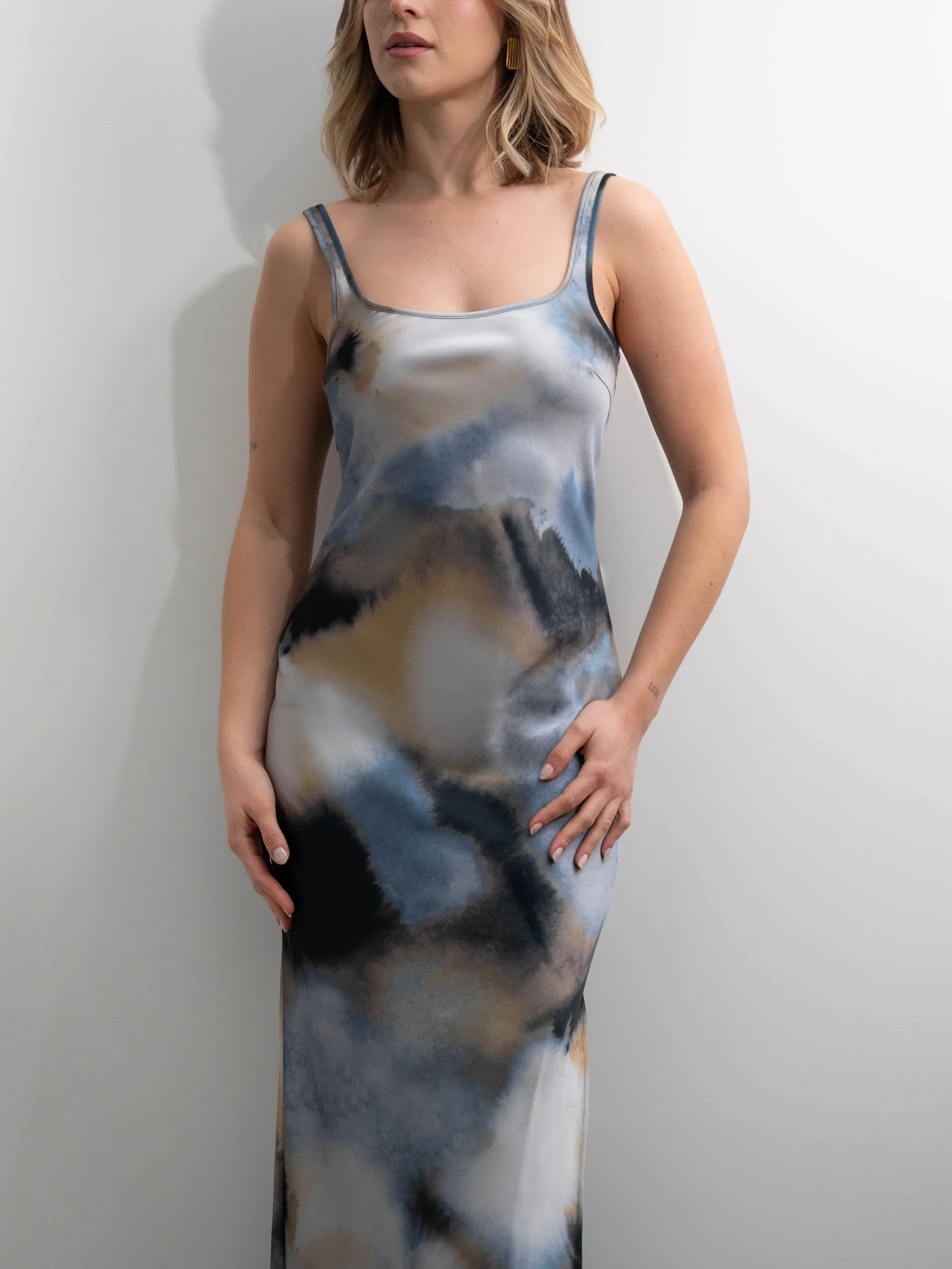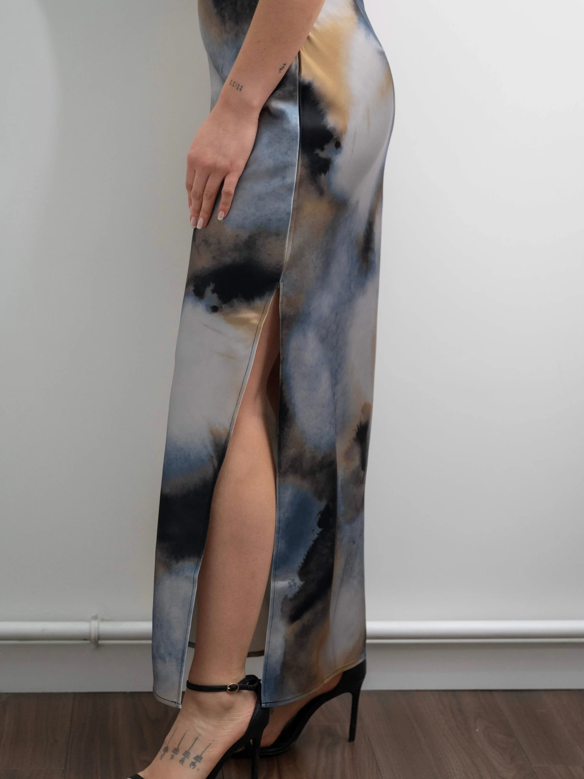 Robe longue en satin biaisée, coupe ajustée. Fente sur le côté.