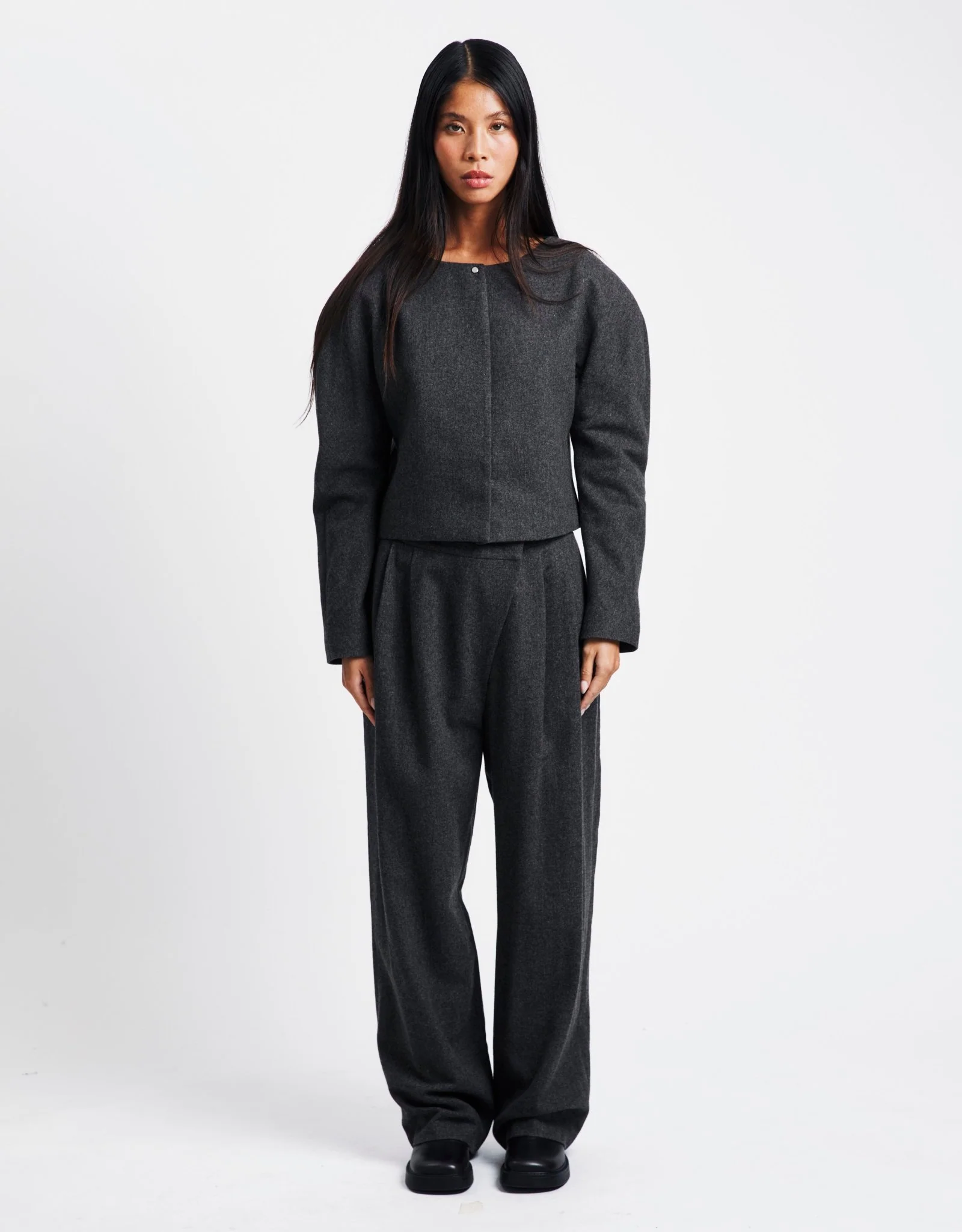 Amomento’s Rounded Shoulder Jacket præsenterer en elegant tilgang til overtøj med sin strukturerede silhuet lavet i et uldblandet melton-stof. Jakken har en tekstureret, børstet overflade, som ikke kun giver dybde til designet, men også fremhæver de karakteristiske afrundede skuldre. Ideel til at løfte en moderne garderobe, forener den ubesværet raffinement med moderne stil. Det velovervejede snit sikrer en flatterende pasform, hvilket gør den til et alsidigt valg for dem, der søger et slankt, men særpræget udtryk.