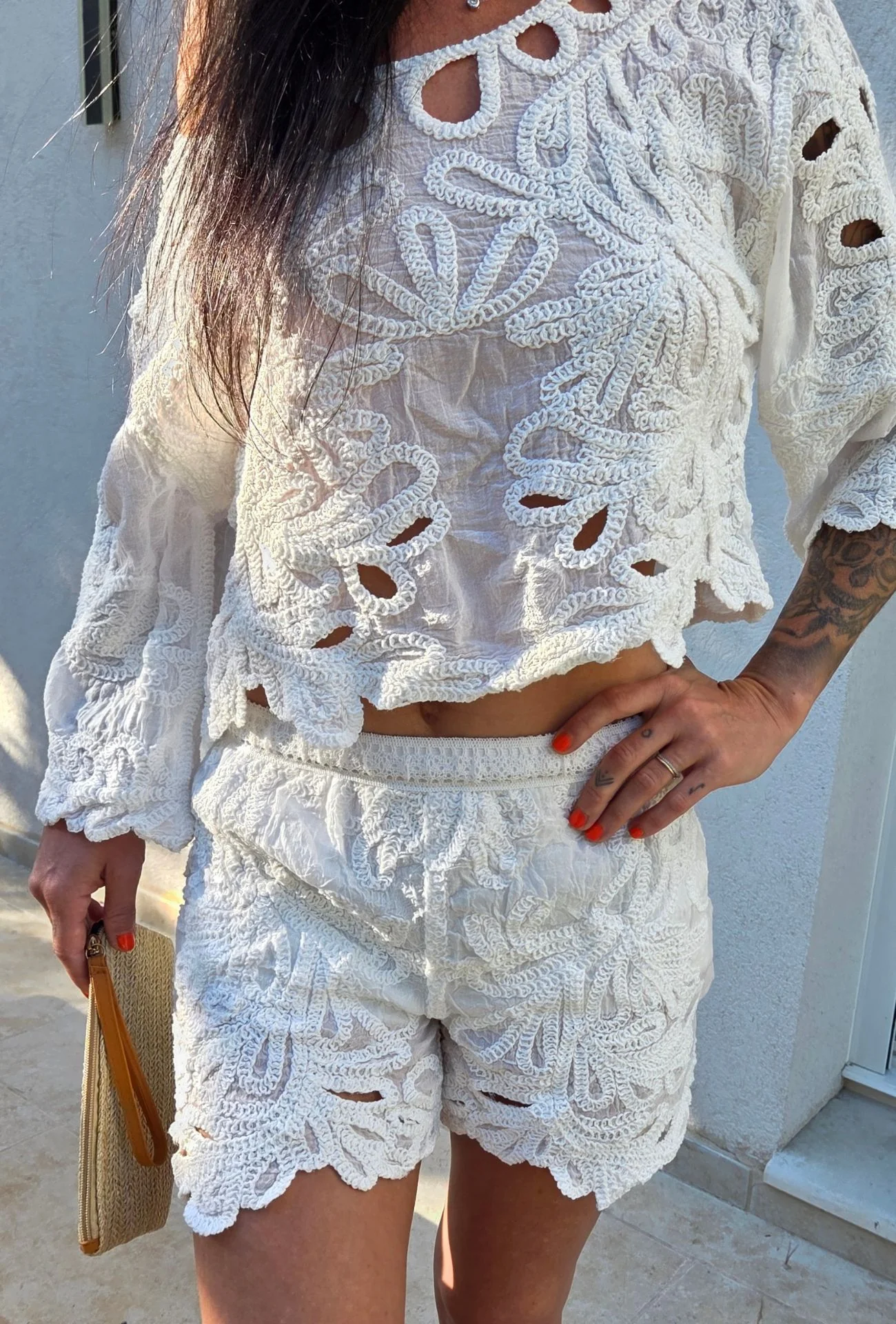 C’est la pièce parfaite pour insuffler une touche romantique et fraîche à votre dressing d’été. Le short Alicia, avec ses broderies délicates et son blanc lumineux, s’associe à toutes vos tenues. Léger, féminin et pratique, il deviendra vite un incontournable de vos looks ensoleillés.