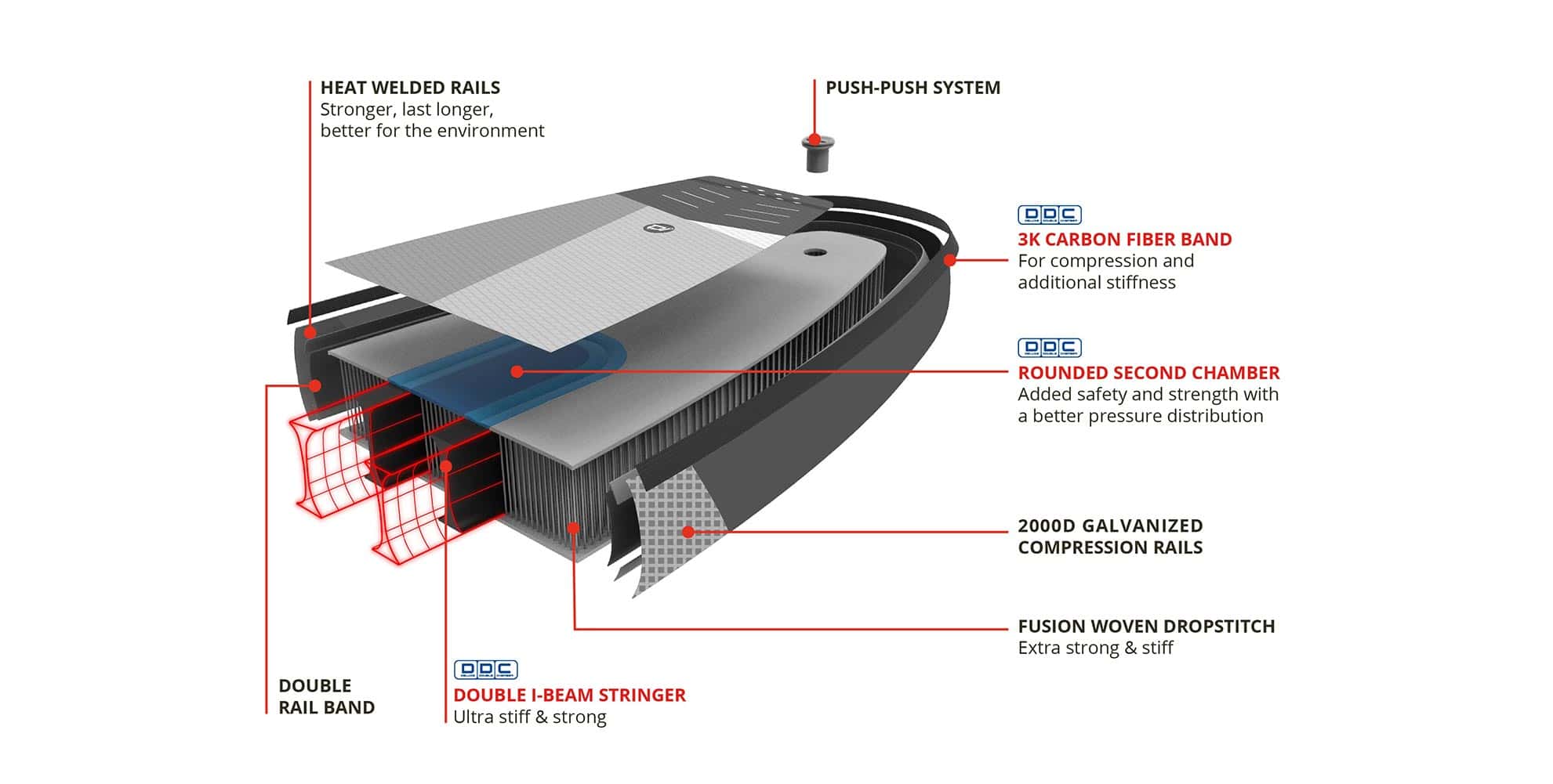 La chambre offre jusqu’à 42 litres de flottaison de sécurité, avec 14 litres même dans les plus petites planches et ne nécessitent que 10 PSI.
