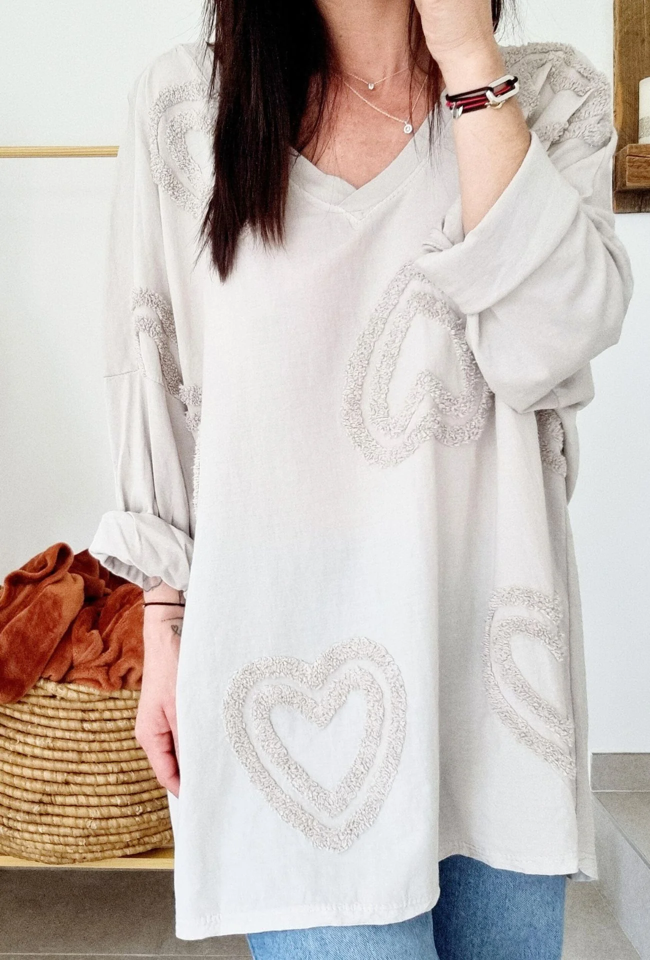 - Détails : Motifs en relief, coupe oversize et manches longues