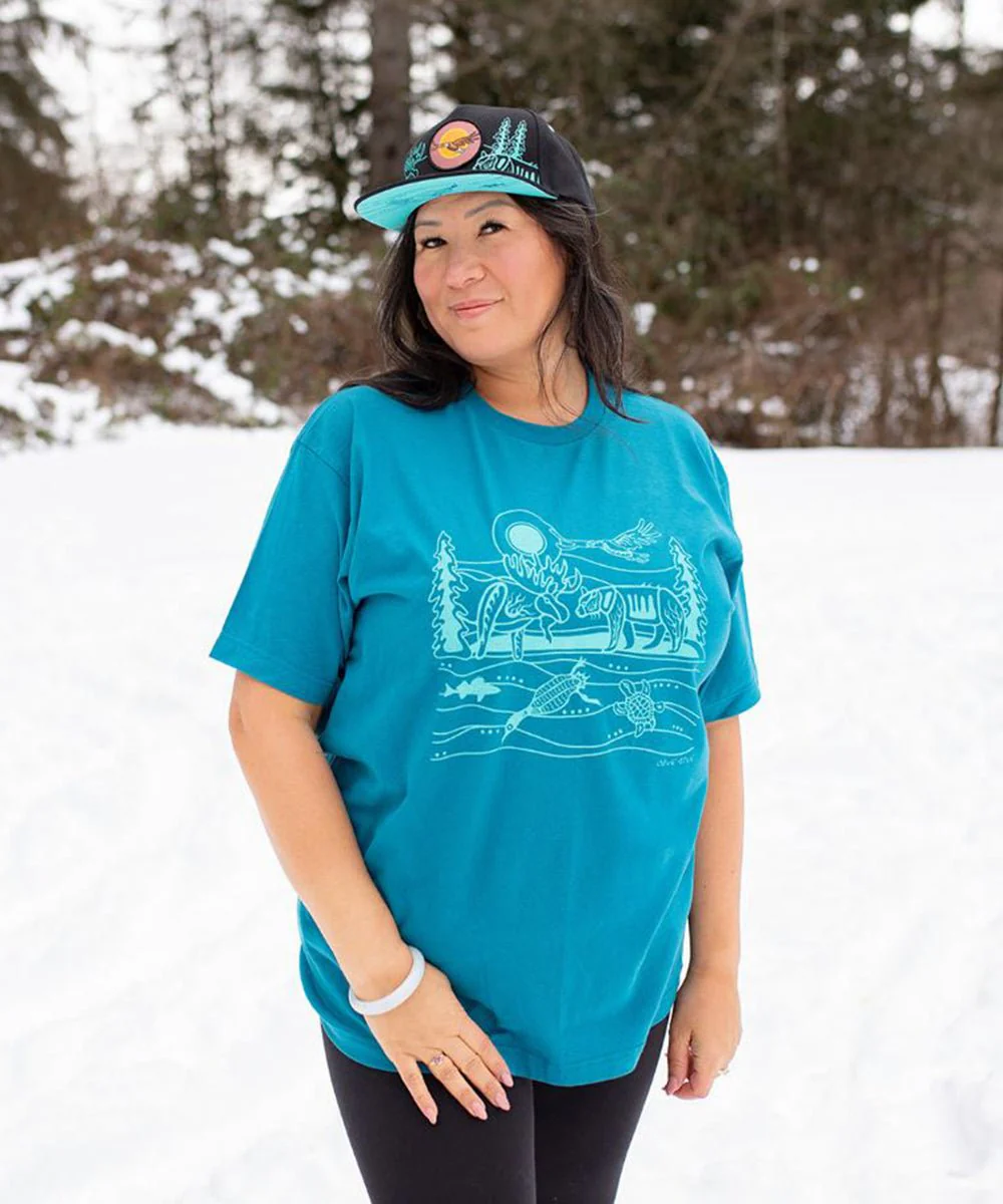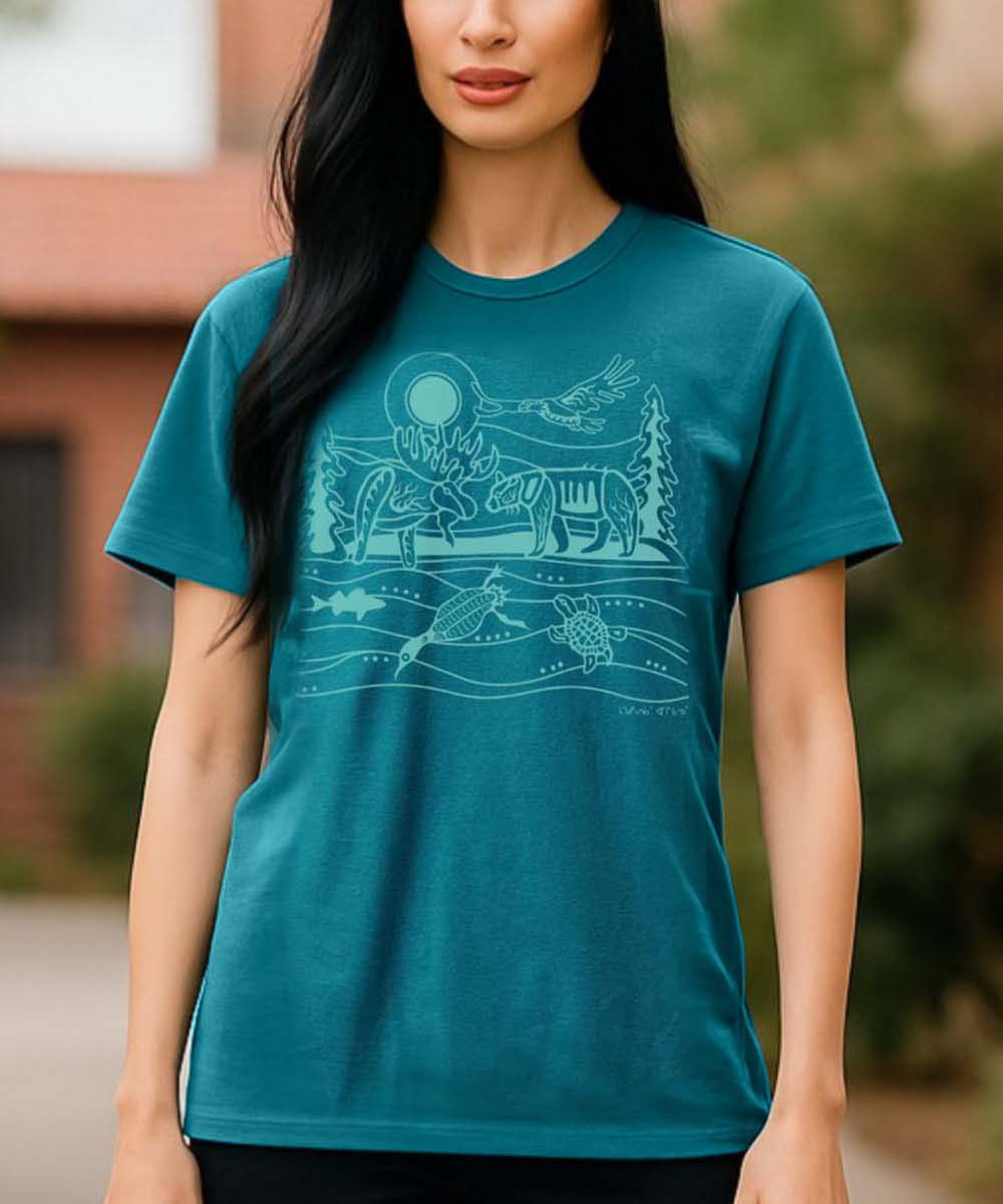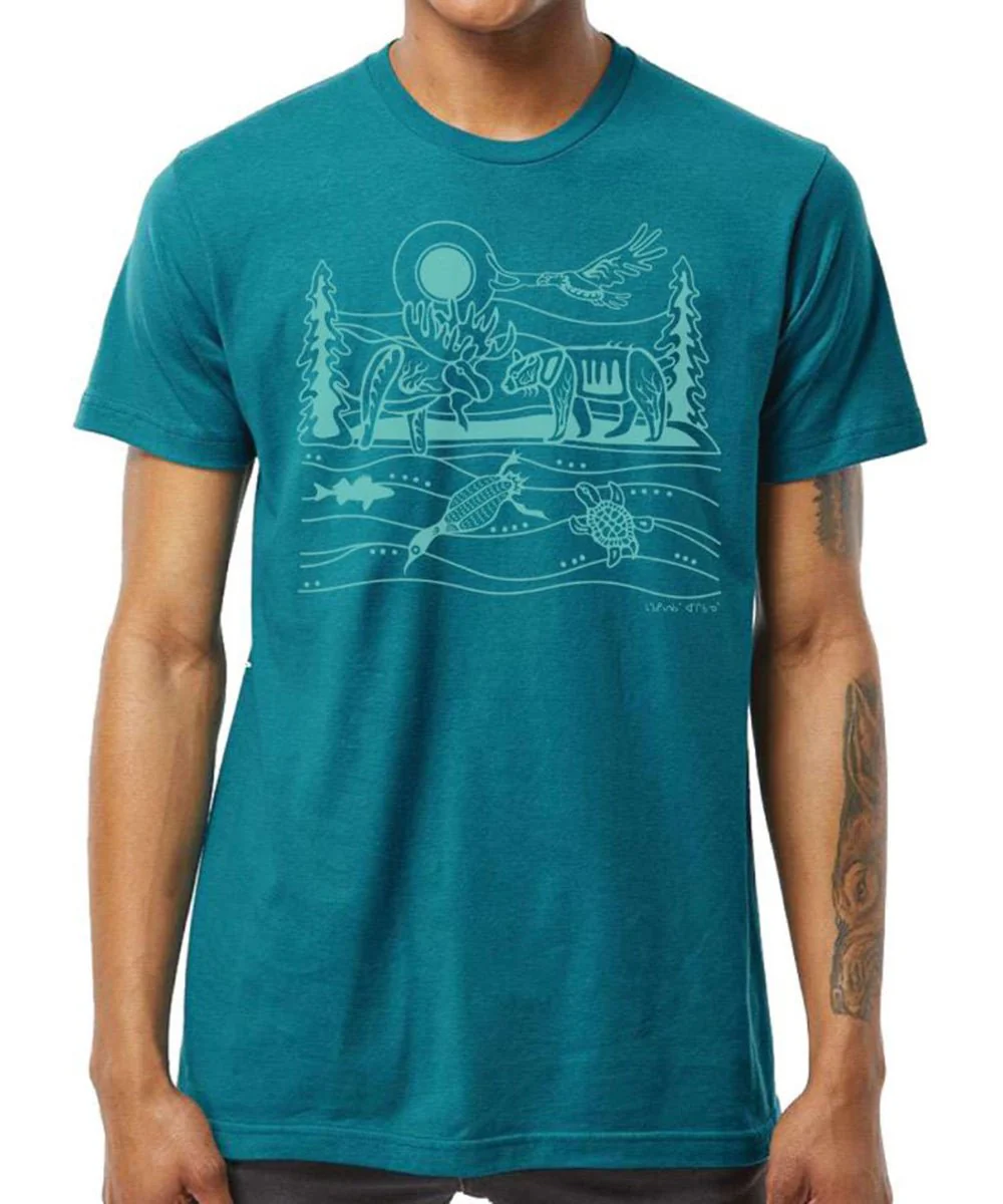 T-shirt de Storm Angeconeb, Lac Seul première nation, Ojibwe »Mon travail est influencé par la nature qui m’entoure. » Storm Angeconeb Extrêmement doux et facile d’entretien. Art Autochtone canadien.