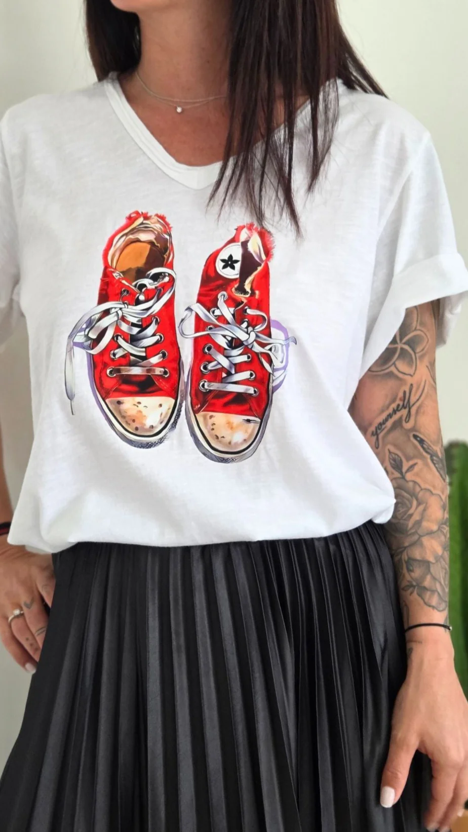 Parce qu’il est à la fois cool, confortable et résolument original. Le visuel baskets est un clin d’œil décalé à la culture streetwear et vous permettra d’afficher une allure fun et affirmée sans en faire trop. C’est LE tee-shirt parfait pour ajouter une note d’humour et de caractère à votre look, tout en restant ultra facile à porter au quotidien.