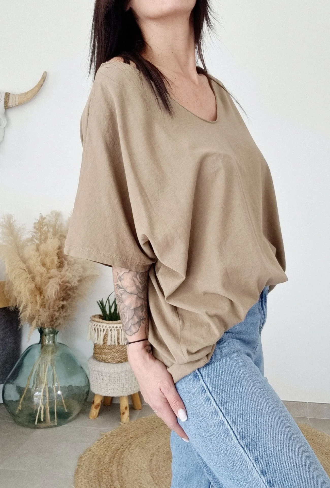 Le tee-shirt INGRID beige est l’alliance parfaite entre simplicité et confort. Avec sa coupe oversize tendance et son col V flatteur, il est idéal pour créer des looks casual-chic au quotidien. Son tissu 100% coton assure une douceur et une légèreté incomparables, parfaites pour toutes les saisons. Une pièce essentielle qui se mariera facilement avec votre garde-robe.