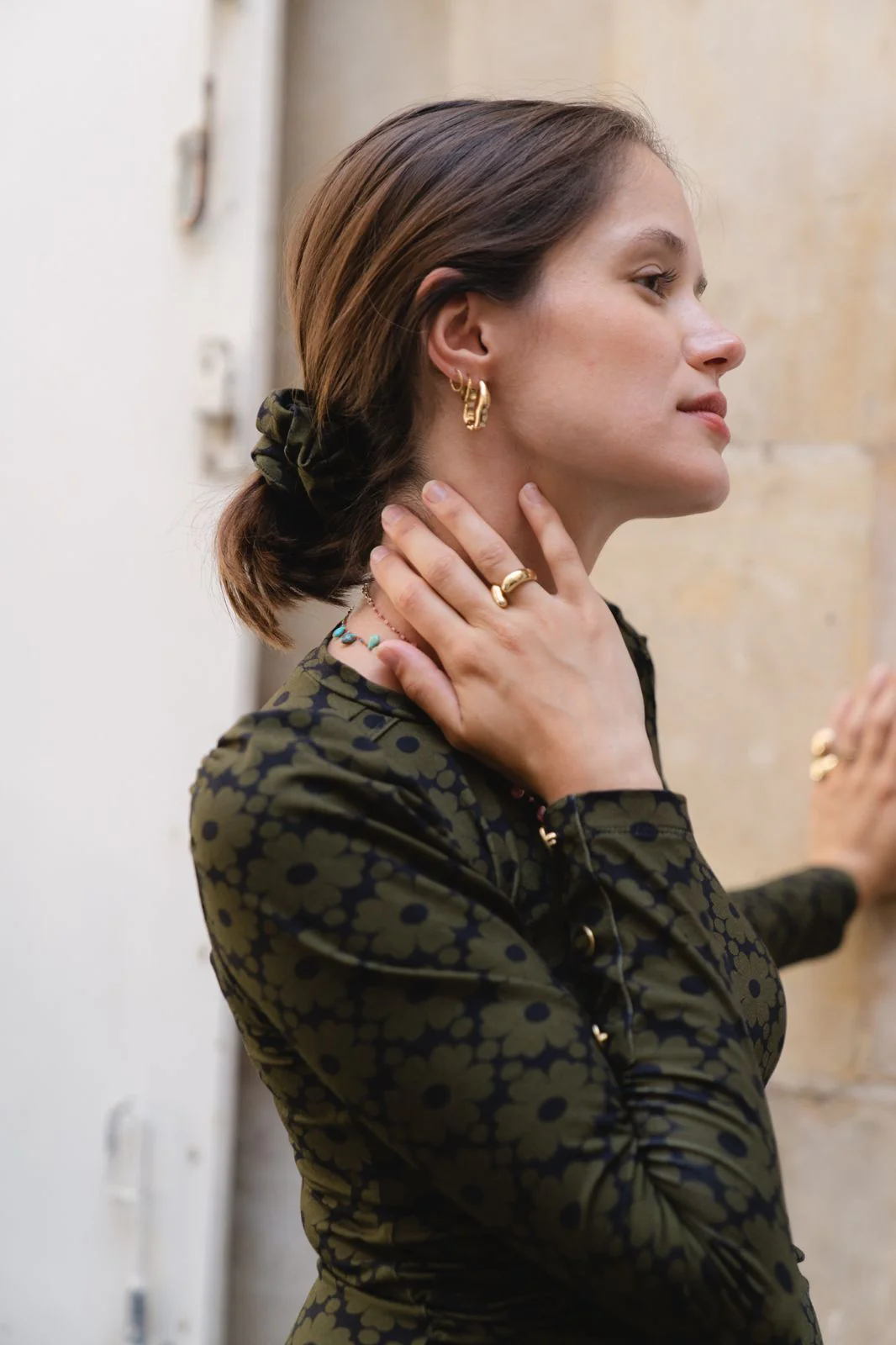 – Manches longues ajustées avec 3 boutons dorés, volume froncé à l’épaule.