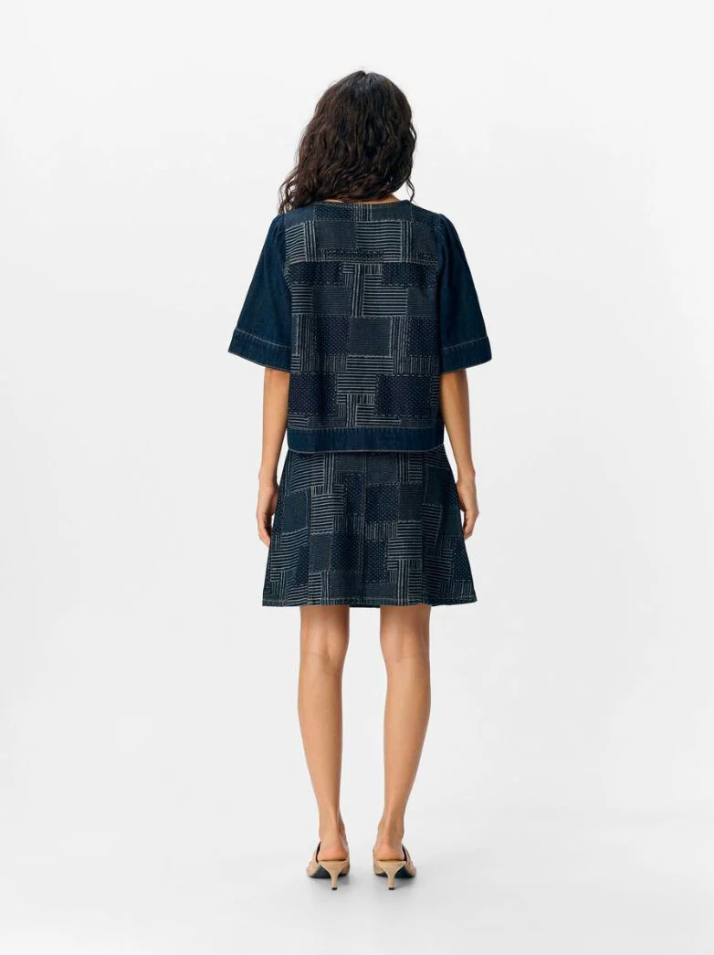 Chemise manches courtes en denim. Pièce d’un ensemble assorti. Motif patchwork. Col rond. Boutonnage sur le devant. Coupe classique. Matières: 80% Coton, 20% Coton Clara mesure 1m74 et porte une taille S.